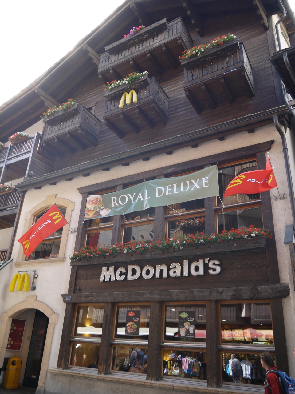 街のメインストリートのバーンホフ通り沿いにあります。建物がスイスらしい木造の建築で、いかにもスイスらしさを醸し出しています。レストランで食事するよりも安上がりですが、セットメニューが千円以上しますので、物価の高さに驚かされました。