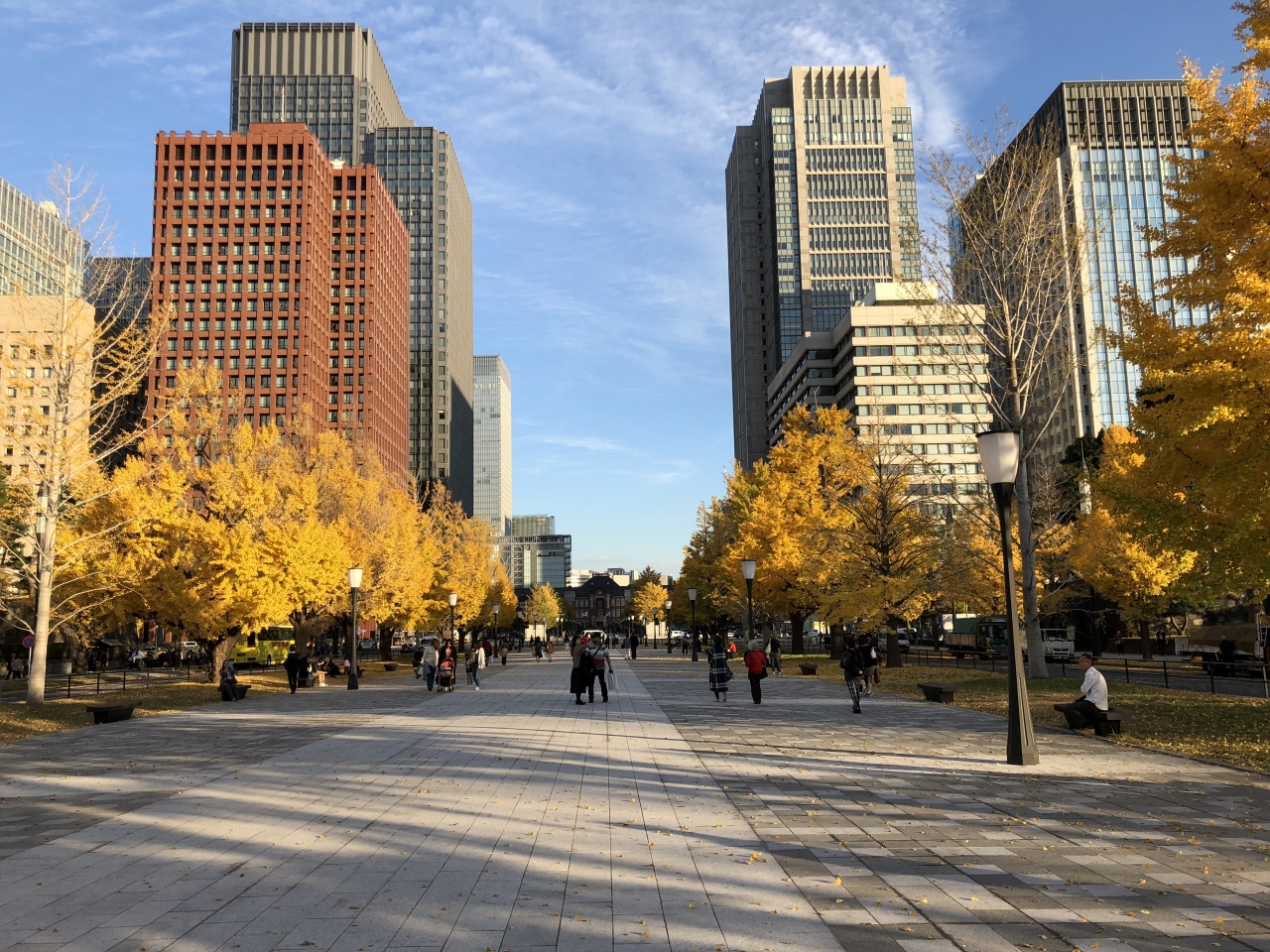 東京駅丸の内側から、皇居へと続く通りです。訪れた時期は、皇居側の通りは木々の葉っぱが黄色に変化していて、とても綺麗でした。ベンチもあるので、ゆっくりと木々の景色をみながら過ごすことができました。四季折々の変化が感じられる場所だと思います。