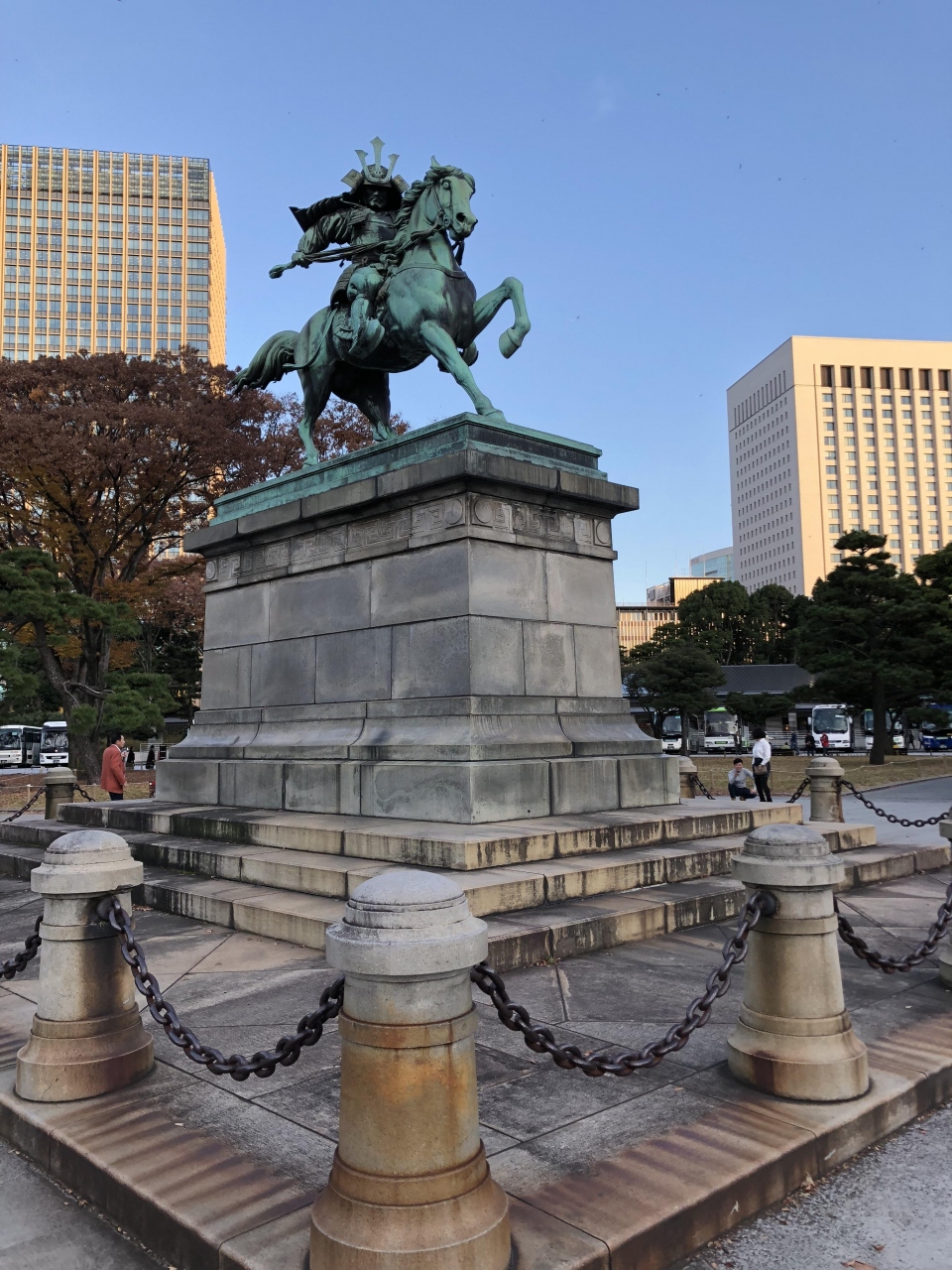 皇居外苑敷地内にある楠木正成の銅像。馬に乗っている銅像で、鎧姿が迫力があります。銅像を囲むように周囲は公園になっていて、ベンチも設置されています。すぐ近くに大型観光バスの駐車場や、レストラン、ショップがあります。