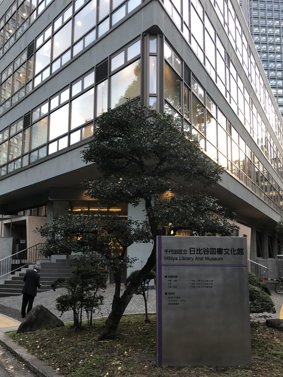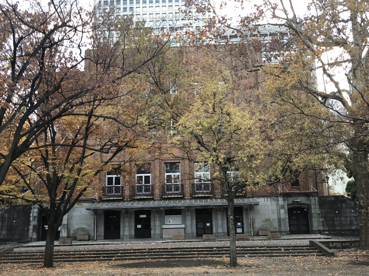 日比谷公園敷地内にある日比谷公会堂。現在は改修工事中で、外観のみを見て楽しみました。目の前にある、にれのき広場の木々の葉が黄色に色着いていたため、公会堂の赤いレンガと相まって、レトロな雰囲気が出ていました。