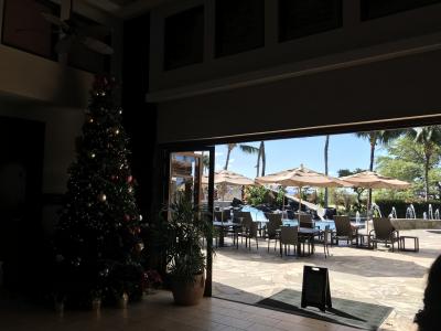 コハラスイーツのロビー。暗いですが、綺麗なクリスマスツリーが飾ってあり...