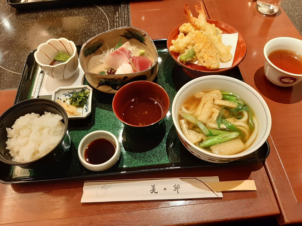 お刺身と天ぷら、おあげの小さいうどんとごはん