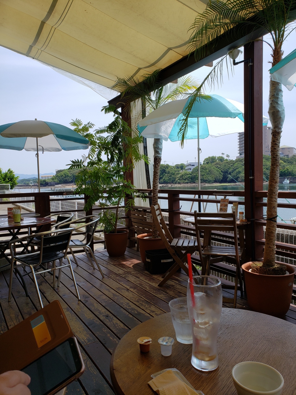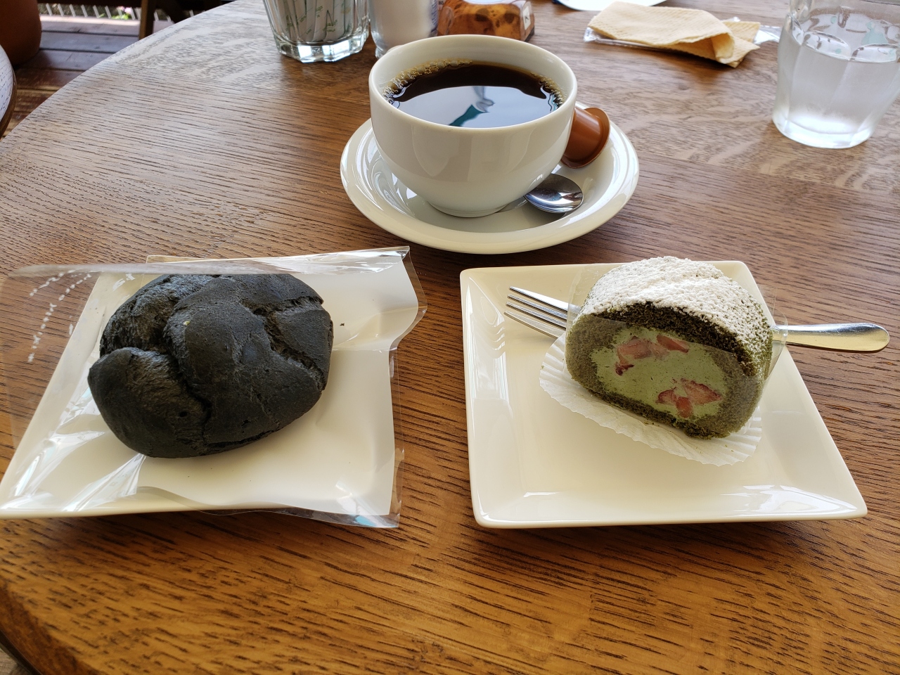 生かげろうは前回テイクアウトしたので今回はテラス席でお茶しました。お目当ての黒糖ロールが無かったので抹茶のロールケーキと気になってた竹炭のシュークリームとカフェインレスコーヒーをオーダー。どれも美味しく頂きました。何より海を見ながらゆっくりいい時間を過ごせました。白浜ではここと和の香珈琲がお気に入りです。次はランチを食べてみたいです。