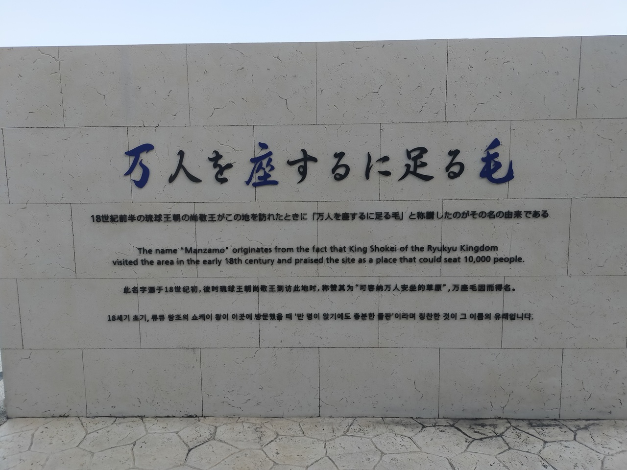 なんの事かよくわからないと思いますが、看板に書かれていました。「万人が座ることのできる広い野原」という意味で、景勝に関して述べた言葉ではないようです。「まんざもう」と言えば名前ぐらいは聞いたことある景勝地で、1度は行ってみたいなと思っていました。なんの知識もなく行ったら、入口がなくて、活性化施設で入場券を買わないといけないそうです。入場券は100円で何度でも入れます。早くつきすぎて740ごろ駐車場に着いたら、一番乗りでした。800に施設が開いて、すぐ入場。15分ぐらいで見て回れたかな。お土産が結構充実していて、空港で買うより絶対安いので限定の泡盛を購入。売店のおっちゃんも優しかったです。