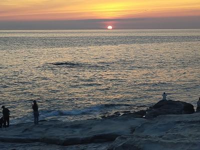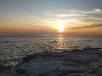 千畳敷も3回目ですが、それぞれに良さがあります。初めての時はこんな景色があるのかと感動、2回目は母親を連れてこられて感動、そして3回目は沈む夕陽をゆっくり見られて感動。ホテルがすぐ近くだったので、チェックインして一風呂浴びて、日の入りの45分ぐらい前に徒歩で千畳敷へ。駐車場は半分ぐらい埋まってましたかね。一通り雄大な景色を眺めて写真を撮って、座りやすいポジションに移動。行き交う船や沈む夕陽を見ながら、贅沢な時間を過ごしました。結婚式の前撮りのカップルや友達グループ、ご夫婦やアマチュアカメラマンなど、たくさんの人が夕陽に魅入っていました。夕陽の時間帯もオススメです。
