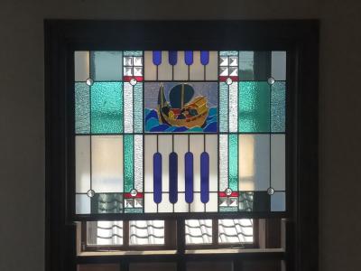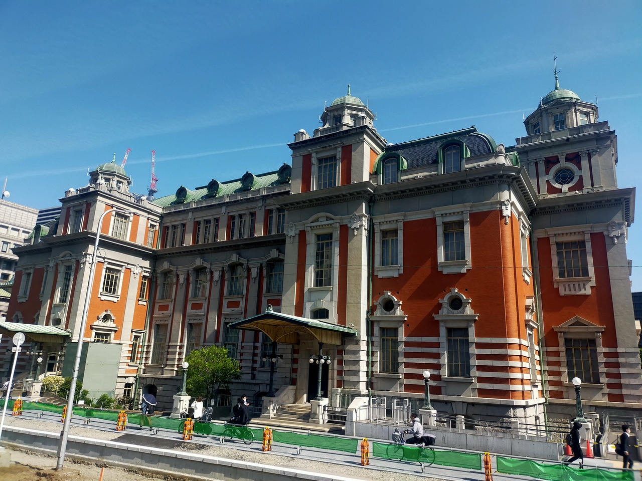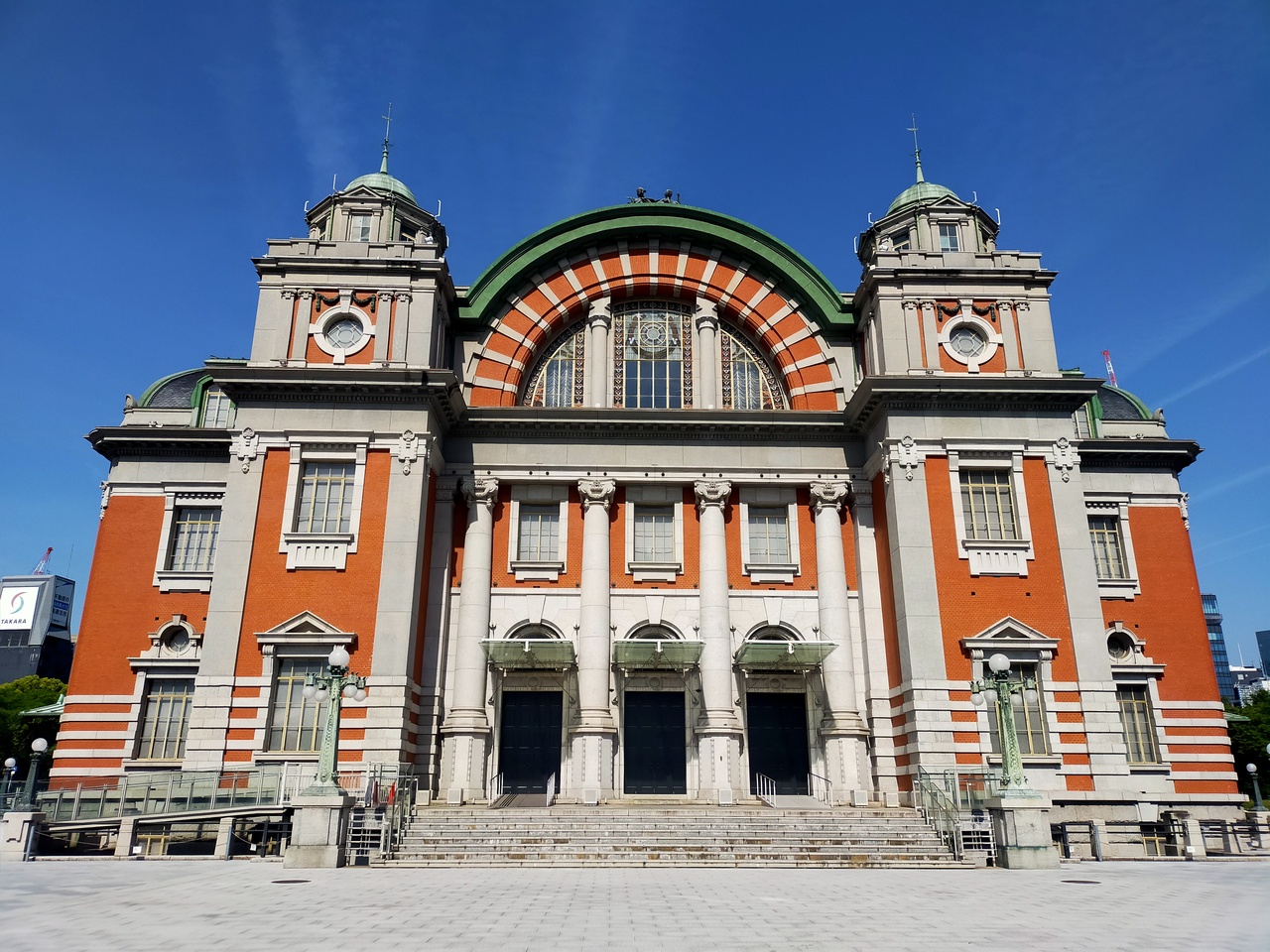 以前は正面玄関前の工事を長いことやっていて、どうしてもフェンスが入ってしまったり、ちょっと斜めからの写真になったりしていました。それが、工事も終わり、歩行者用スペースも広くなったので、車を気にせずに写真が撮れます。正面から見る公会堂は大阪のシンボルですね。民の力で建てられた公会堂。地下にはその歴史を展示した資料室もあります。また、ガイドツアーも開かれていて、予約は必要ですが、貴重な話が聞けます。中から見るステンドグラスも綺麗ですよ。