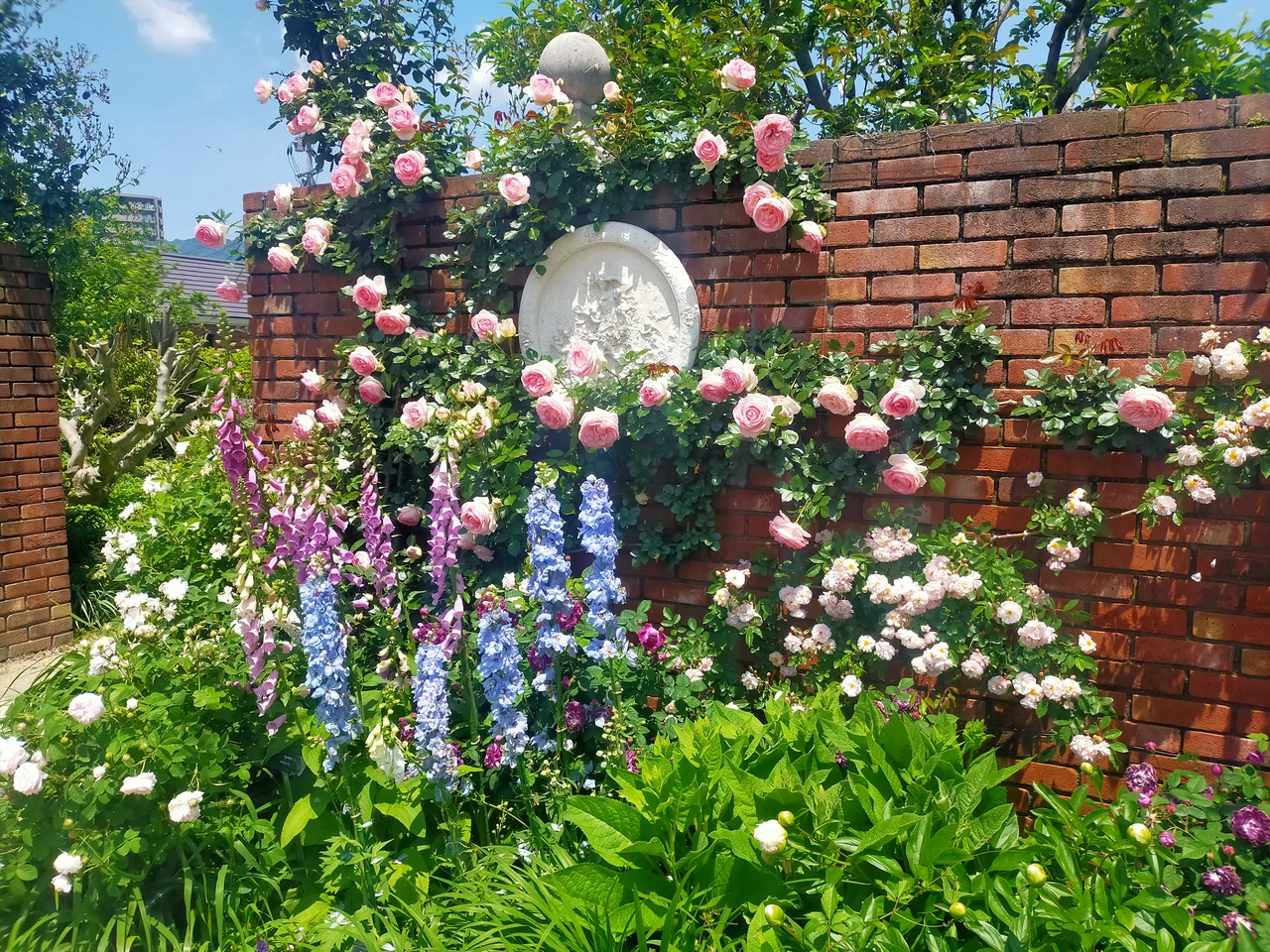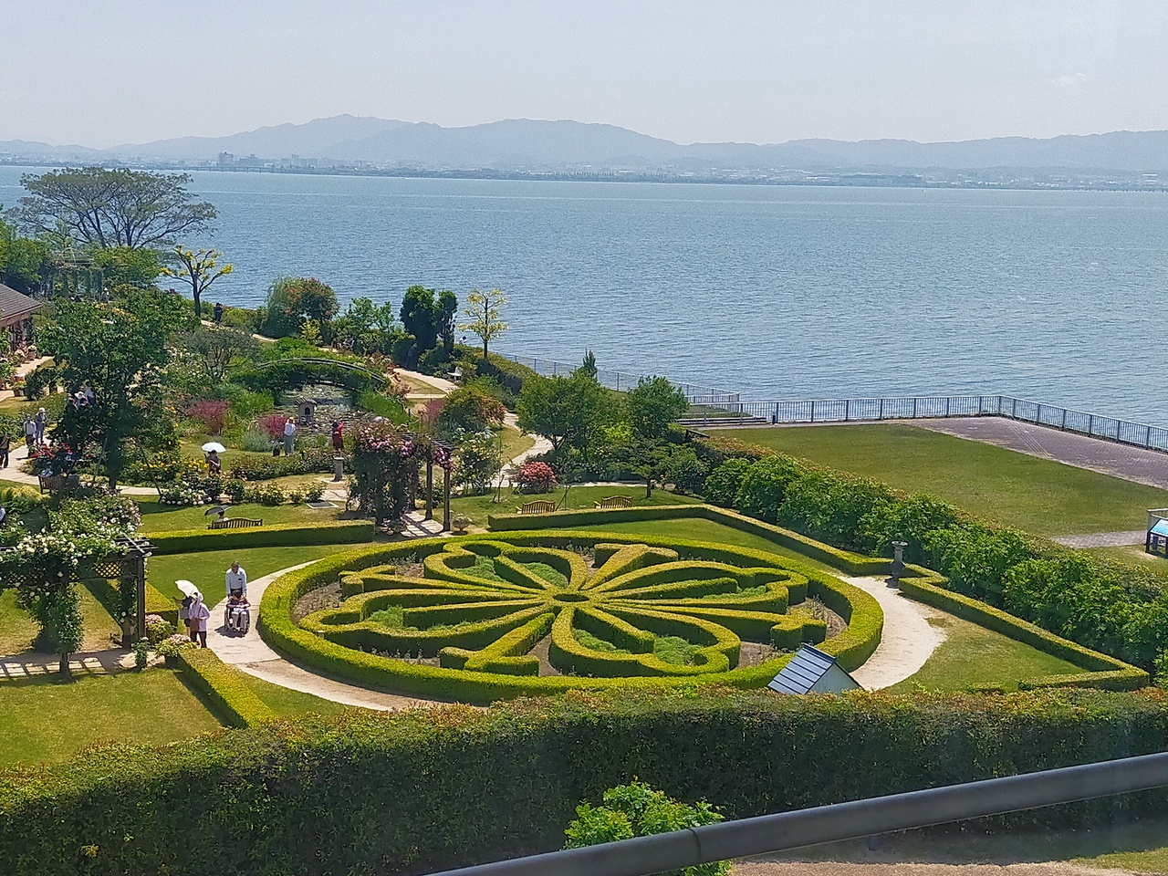 ゴールデンウィーク明けの平日、イングリッシュガーデンの薔薇が見たくて行ってきました。晴れてる日を選んで行ったので、そりゃ綺麗ですよね。色とりどりの薔薇の花が咲き誇ります。また、生垣で作られたノットガーデンのデザインも見どころです。薔薇のアーチや庭の池もあり、歩いて回るのも楽しいです。専門のローズソムリエが監修してお庭が作られているとのことなので、その美しさは折り紙付き。琵琶湖岸で心地よい風に包まれてお庭を散策するのは至福の時間です。
