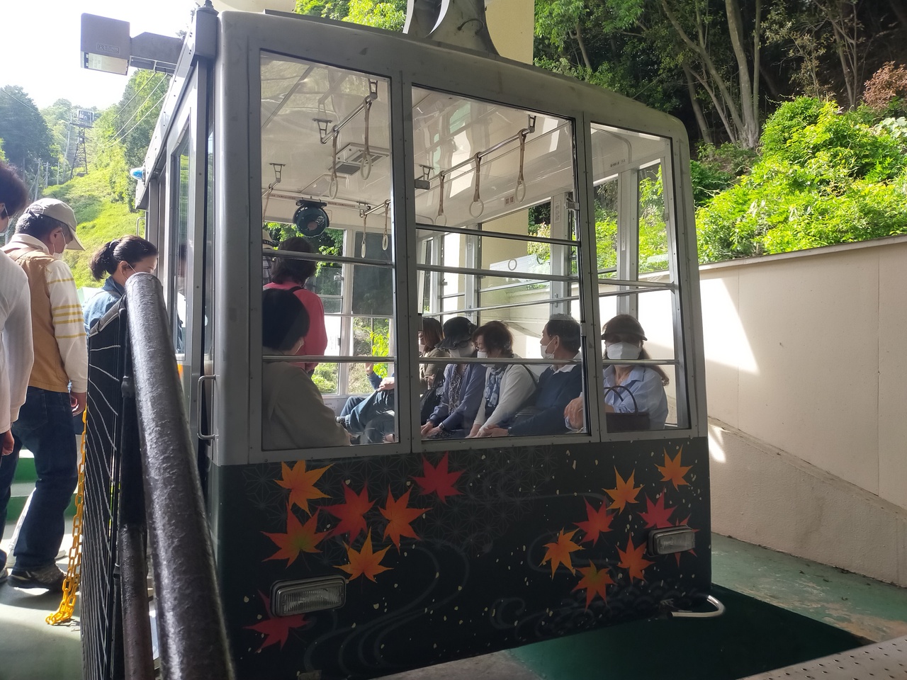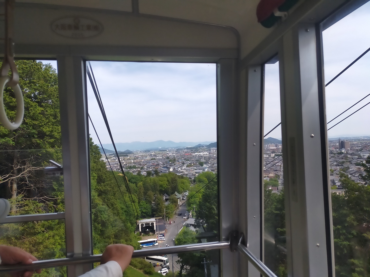 近江八幡は3回目ですが、初めてロープウェイに乗りました。日牟禮八幡宮の奥が乗り場で、近江鉄道が運営しています。5月の五月晴れの陽気の中、ロープウェイの中を抜ける風が気持ちいいです。山麓駅を出ると、