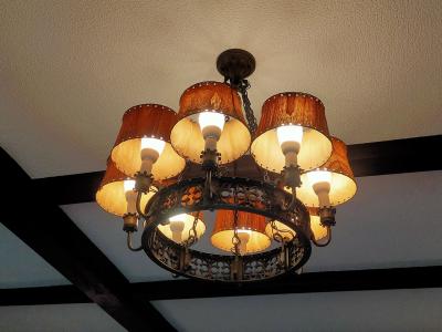 まず正面から、ハーフティンバーが目を引きます。クローバーがあしらわれたベイウィンドウもオシャレです。中に入るとログハウス調で、広い応接室が見応えあります。黒の木材を使った骨組みがシックで、照明にも工夫が見られます。
