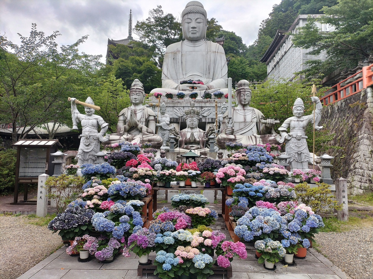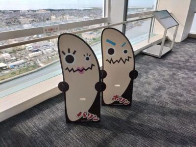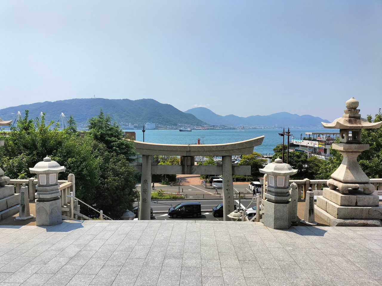 唐戸市場から信号を渡って直ぐに、大きな鳥居と階段があります。関氏の氏神だそうです。階段を上ると、夏越しの祓の茅の輪に風鈴が揺れていて、涼を感じました。また、手水鉢にもひまわりがいけられていて、フグの陶器が泳いでこちらも涼し気です。お参り後に振り返ると、関門海峡を行き交う船が見え、こちらも絶景。日本一のふぐの象やふぐ絵馬もあり下関に来たって感じです。