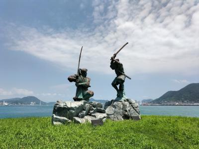 下関は何度か行ったことありましたが、巌流島は初めてでした。唐戸と門司港から船が出ています。乗船は5~10分ほど。島に到着したら、桟橋というかコンクリの護岸に接岸。ターミナル建物などはなくて、雨ざらしです。帰りの船の本数に注意しながら散策。東屋が2つほどありましたが、それ以外は基本てきに遮るものはなく日差しが照りつけます。道中関門海峡が綺麗に見えるビュースポットがあり、それを過ぎると小高い丘の上に武蔵小次郎の銅像が。その下には将棋の羽生さんと広瀬さんの手形がありました。島自体は小さいので、銅像を見てプラプラ歩いて、20分ぐらいで帰りの船に乗りました。こんなもの…なのですかね。なにか見逃してる気もします。