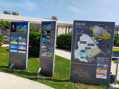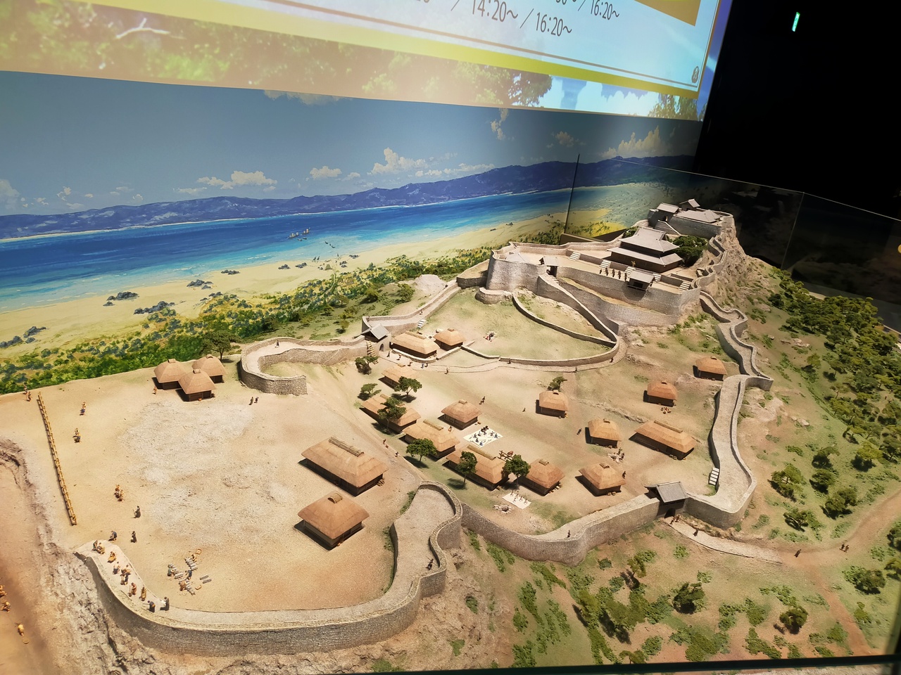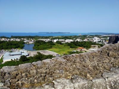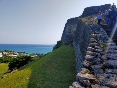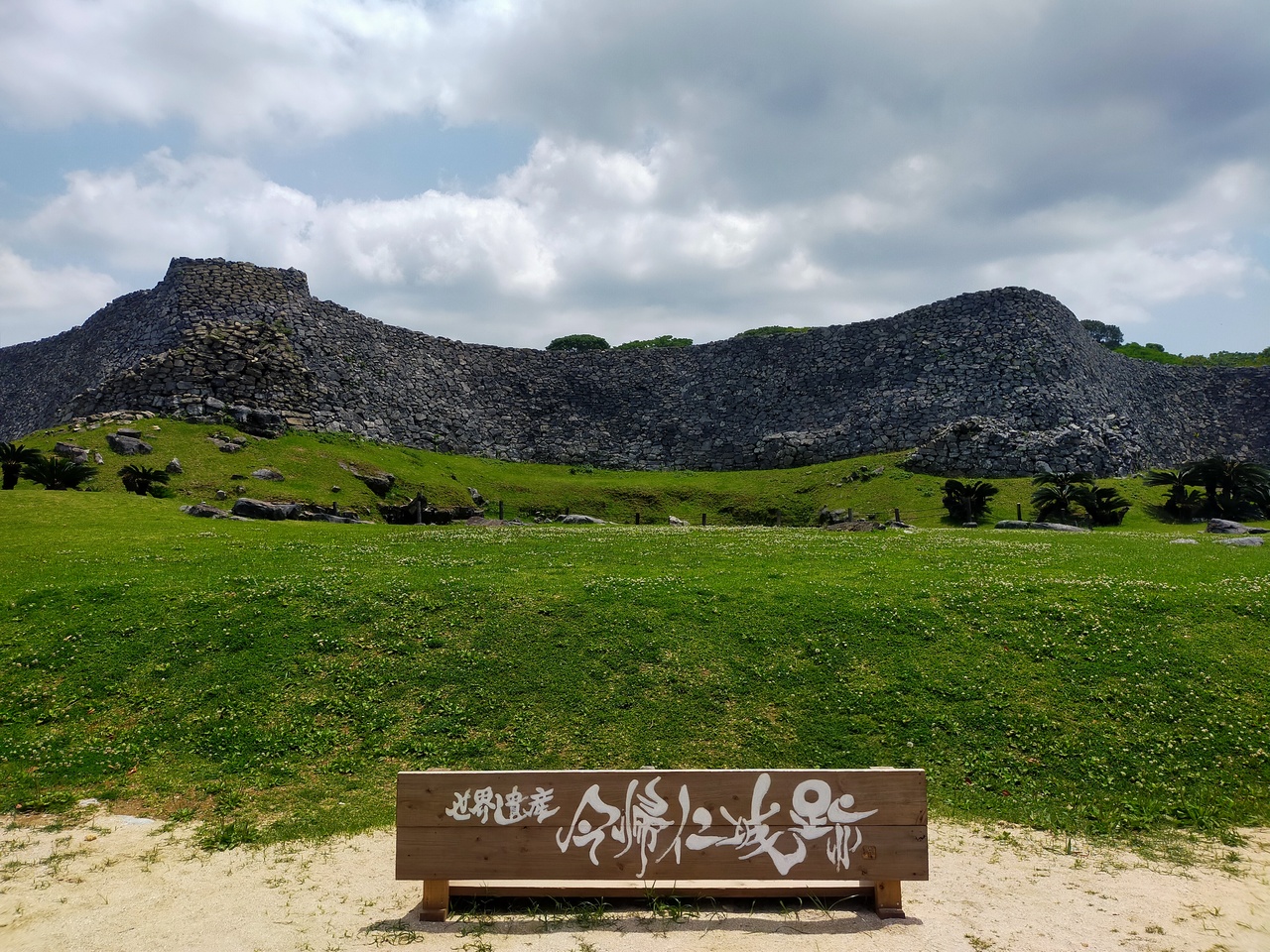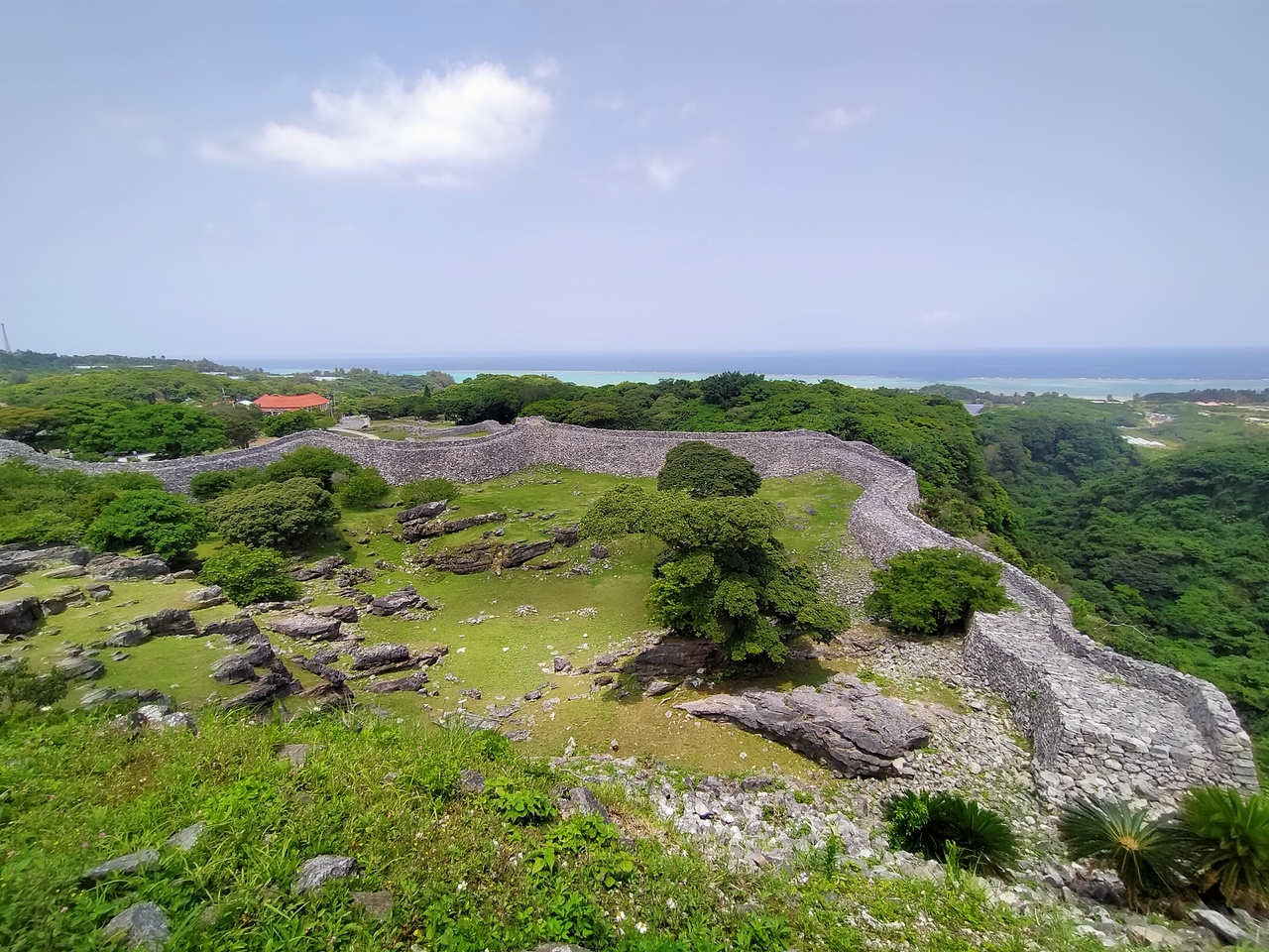 こちらの勝連城も電動カートで城の入口まで送ってくれました。あまわりパークで歴史を見てから来たので、大きいことは分かっていましたが、まさかここまでとは。城壁の高さにまず驚きます。自然の地形を活かして建てられているのもあり、攻めるのは容易ではなかったと思ます。また、祭祀用の建物の礎石も残っていて、馬を放牧したり田畑があった区画もあり、ひとつの都市として機能していたことがわかります。これだけ大きな城郭は本土で見ることはあまりなく、また日本の城の石組みとも違うので、イギリスやスコットランドの城郭を思い浮かべてしまいました。