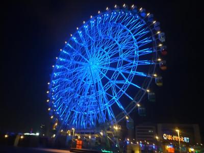 観覧車がライトアップで綺麗。海沿いを歩いているだけで気分が高まります