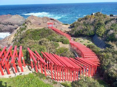 岸壁に立つ鳥居群は、青の海、崖の茶色、鳥居の赤のコントラストが綺麗です