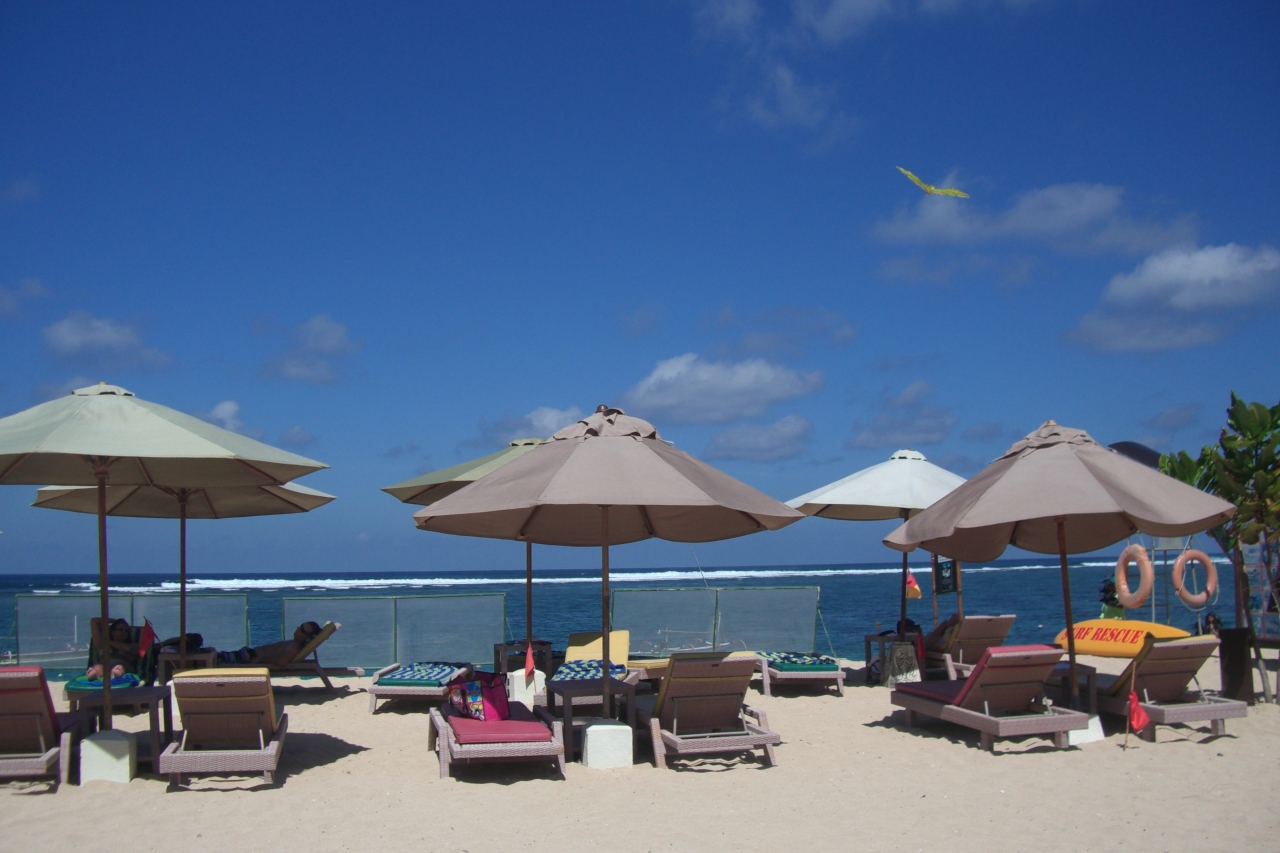 ノボテルが好きで3回のバリ旅行のうち1回はブノア、2回はこのヌサドゥアに滞在しました。ビーチ沿いにはないもののプライベートビーチまで5分の送迎バスが頻繁に行き来してるので便利ですしプールサイドのチェアがスタイリッシュでリゾート感があります。レストランや小さなカフェもおしゃれで何度でも泊りたいホテルです。写真はプライベートビーチのビーチクラブです。