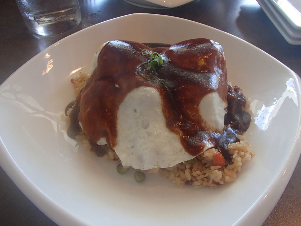 ハナウマ湾が満車で入れず、仕方なくココマリーナで時間を潰そうとランチを兼ねて行ってきました。何かの本でショートリブロコモコが旨いと見た記憶があったので早速注文。ハンバーグの替わりにショートリブが入っているロコモコです。味は、期待が高すぎたのか、う~ん・・・まぁ普通の感じかな、グレイビーソースにもう少し旨みがあると思いましたが。。。話のタネに食してみました。