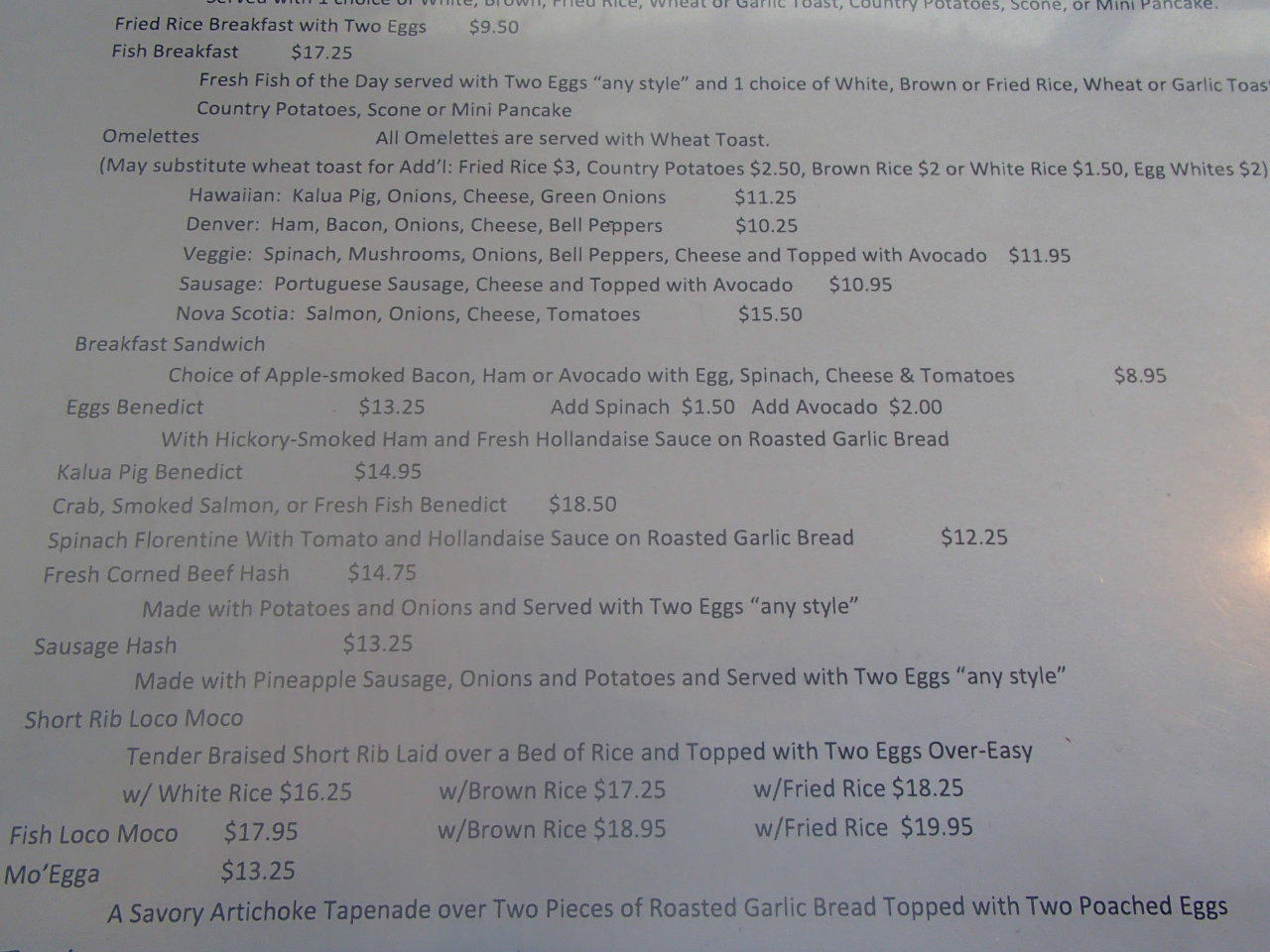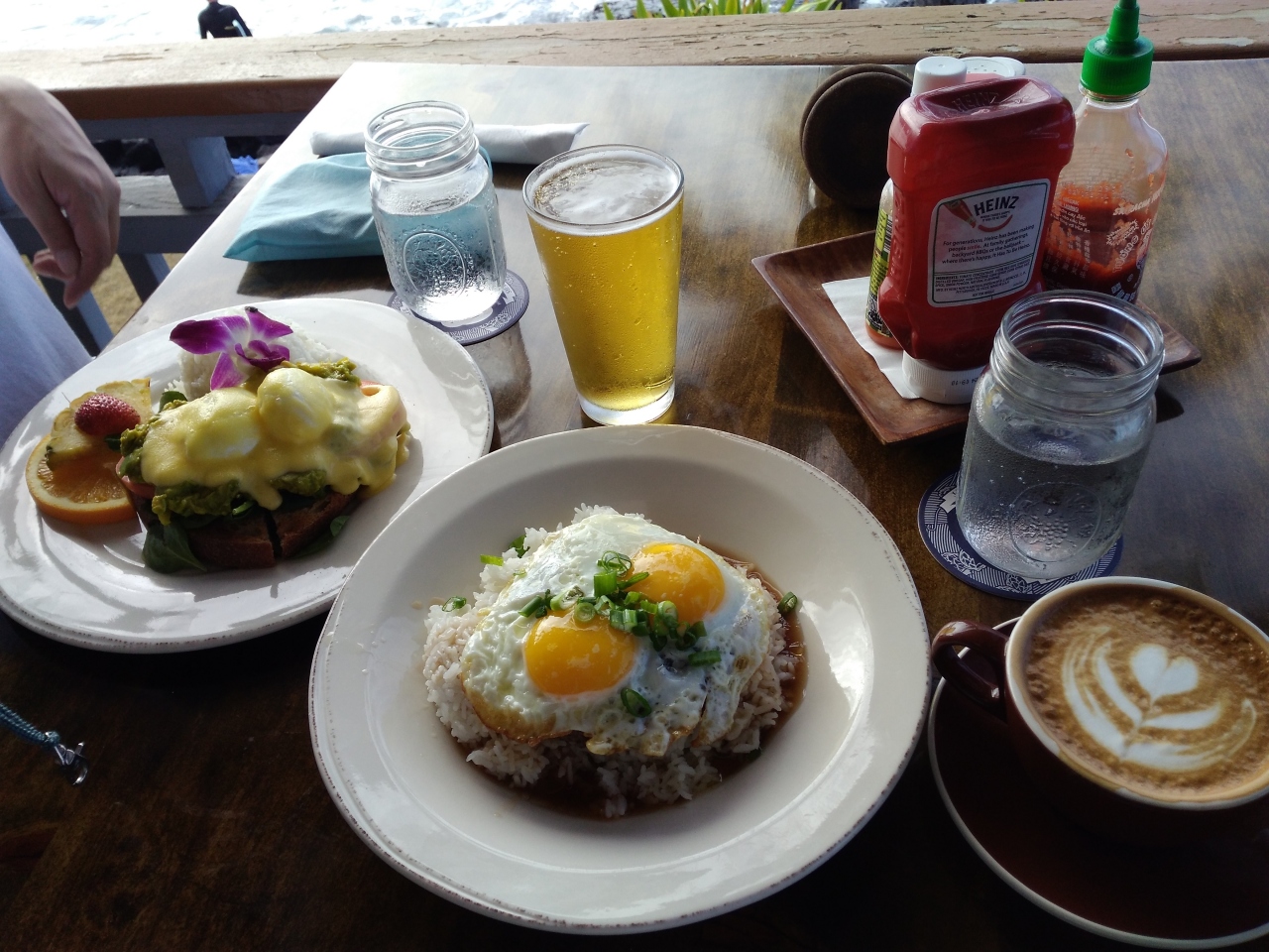 ヒルトン・ワイコロアビレッジに宿泊していたので、カイルア・コナ方面に行ってみたいと思って選んでみたのがこの店。朝の早いタイミングで訪れたので列ばずに入れましたが、店を出るときには行列ができていました。オーシャンフロントのロケーションは抜群でこれが人気の秘密なのかなと思いましたが、料理の味はまずまずでした・・・