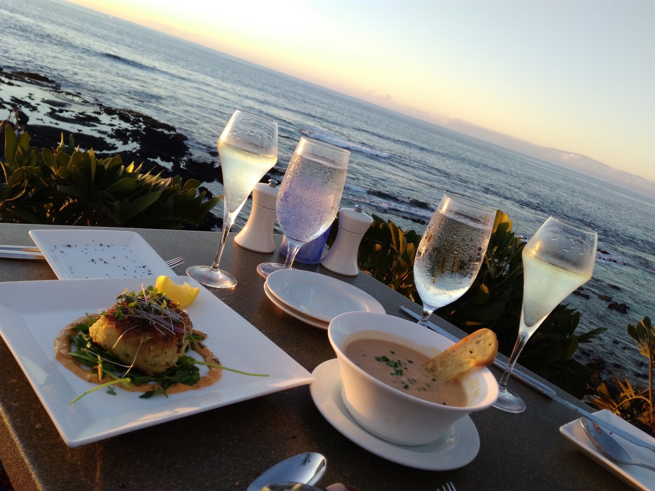 サンセットが真前で見られる最前列は$25の予約料がかかりますが、シャンパンとオードブル1品がついているのでお得だと思います。前に遮るものが何もないので、ゆっくりとサンセットを楽しみながら美味しい食事を頂けます。