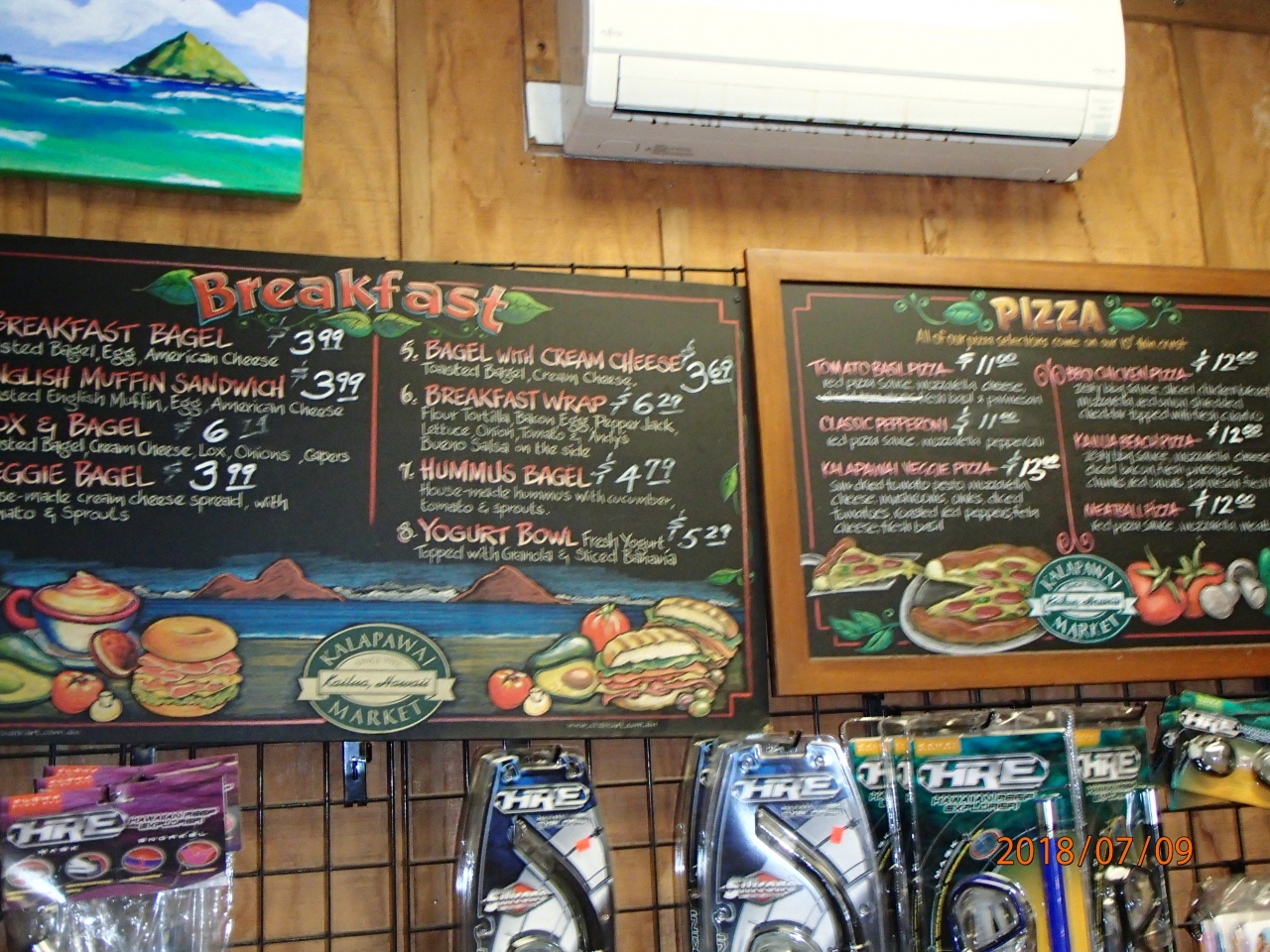 このカラパワイマーケット、一度は見かけたことがあると思いますが、カイルアの中心地からビーチに行く途中にあり、緑色の外観が印象的なレトロなスーパーです。食料品からみやげ物までそこそこ揃っており、イートインできるスペースも確保されています。