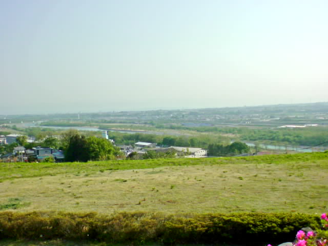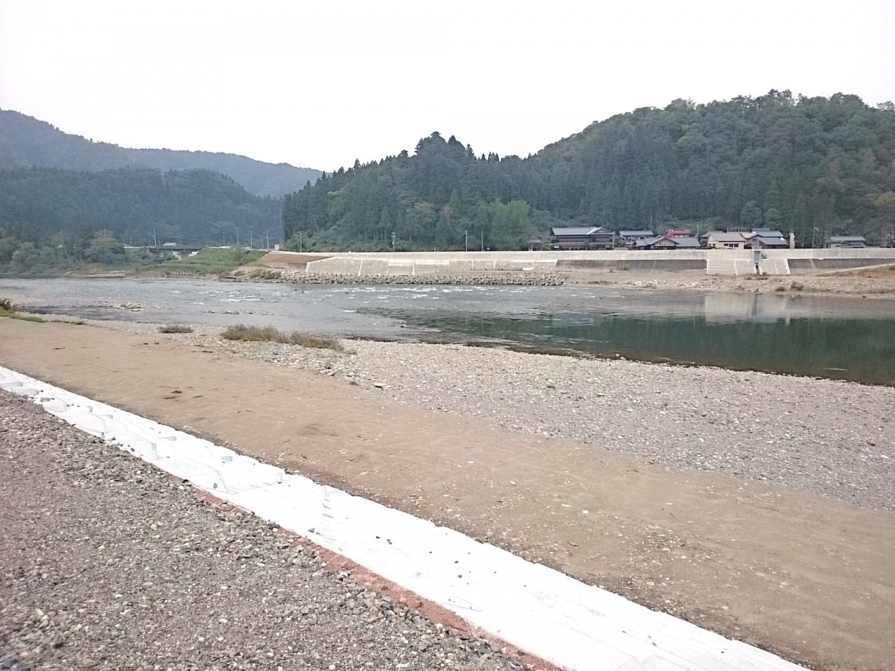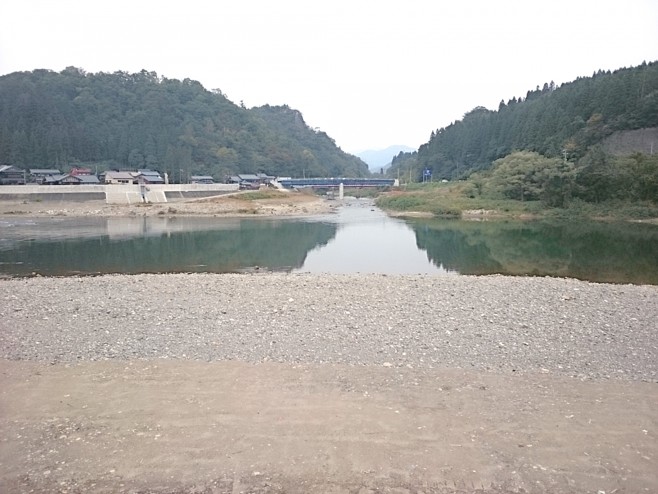 大きな駐車場に裏手を流れる阿賀野川の景色、