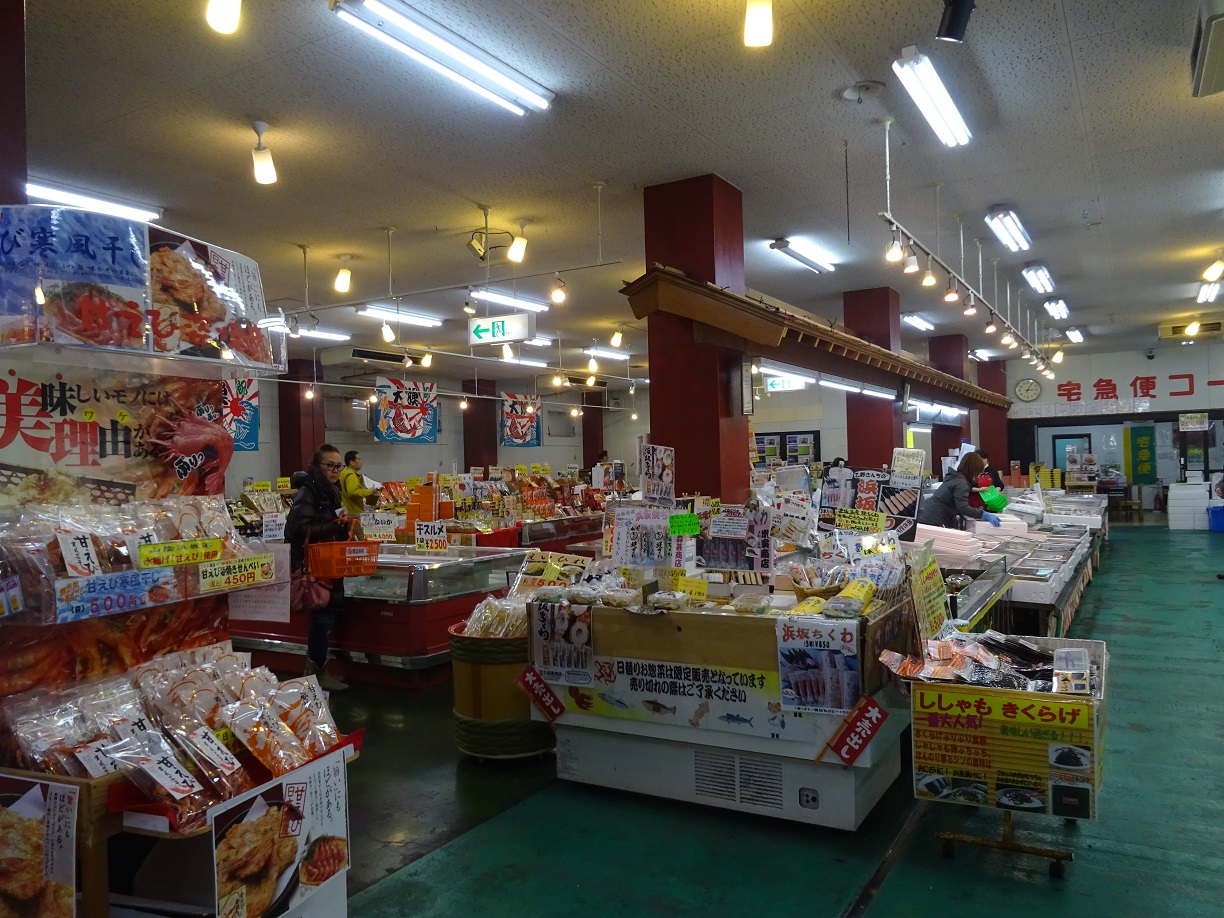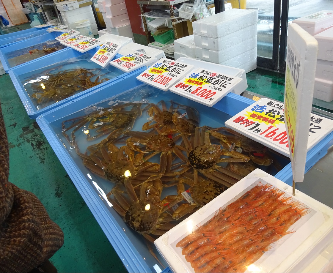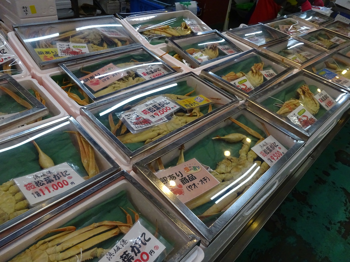 最初に1階のお土産売り場に通され、大きなズワイガニや各種魚などが売られている場所に。