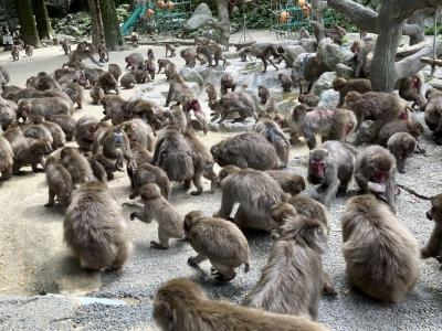 餌の時間になるとあっというまに数えきれない程のサルたちがやってきます。今は出産の時期とのことで、わが子を抱いたお母さんサルが、何匹もいました。