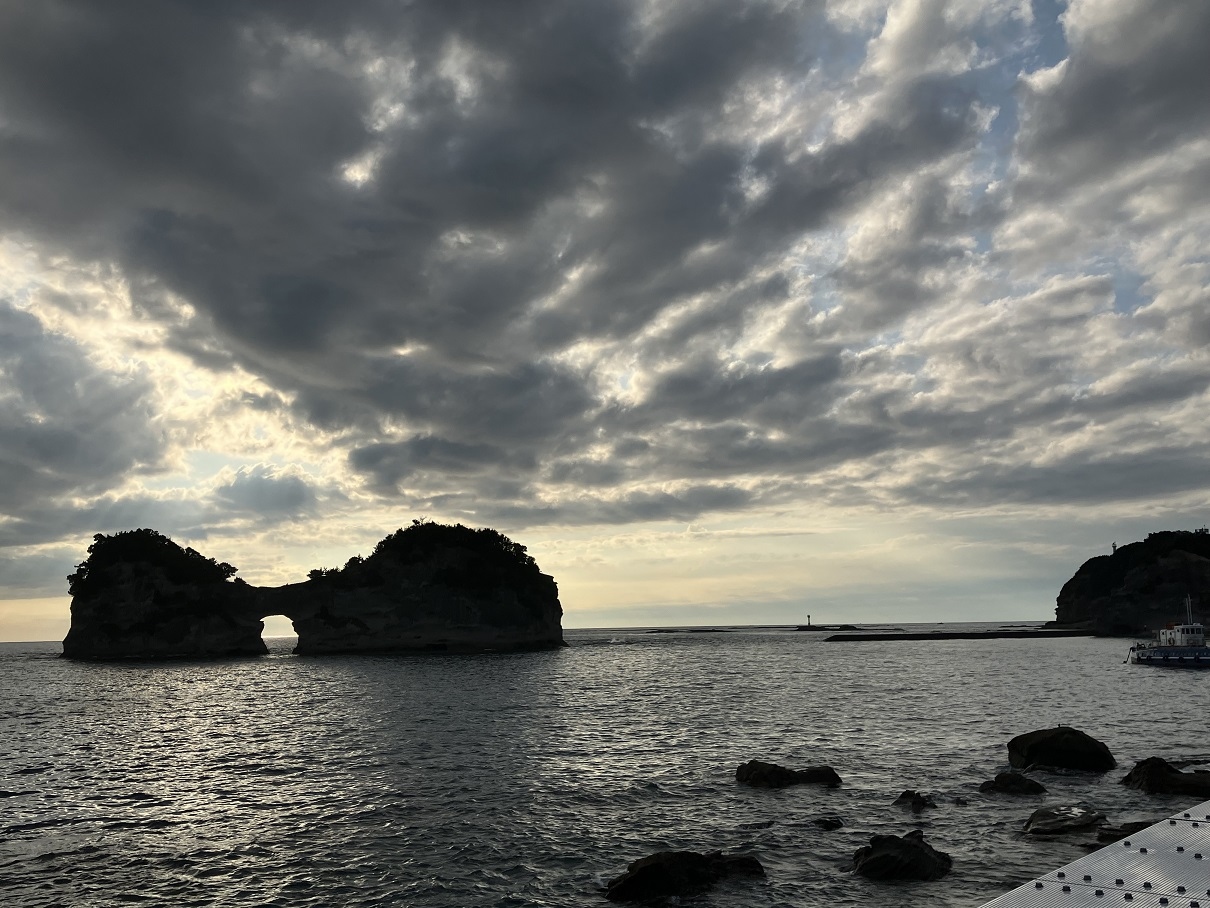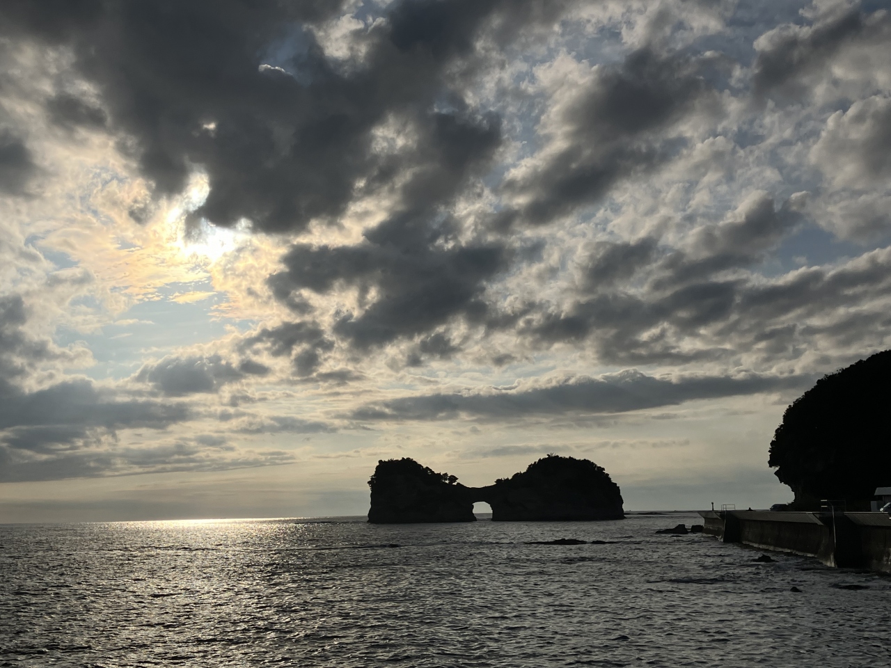 円月島の丸い穴に見事に夕日が入った携帯写真を、見せてくれました。