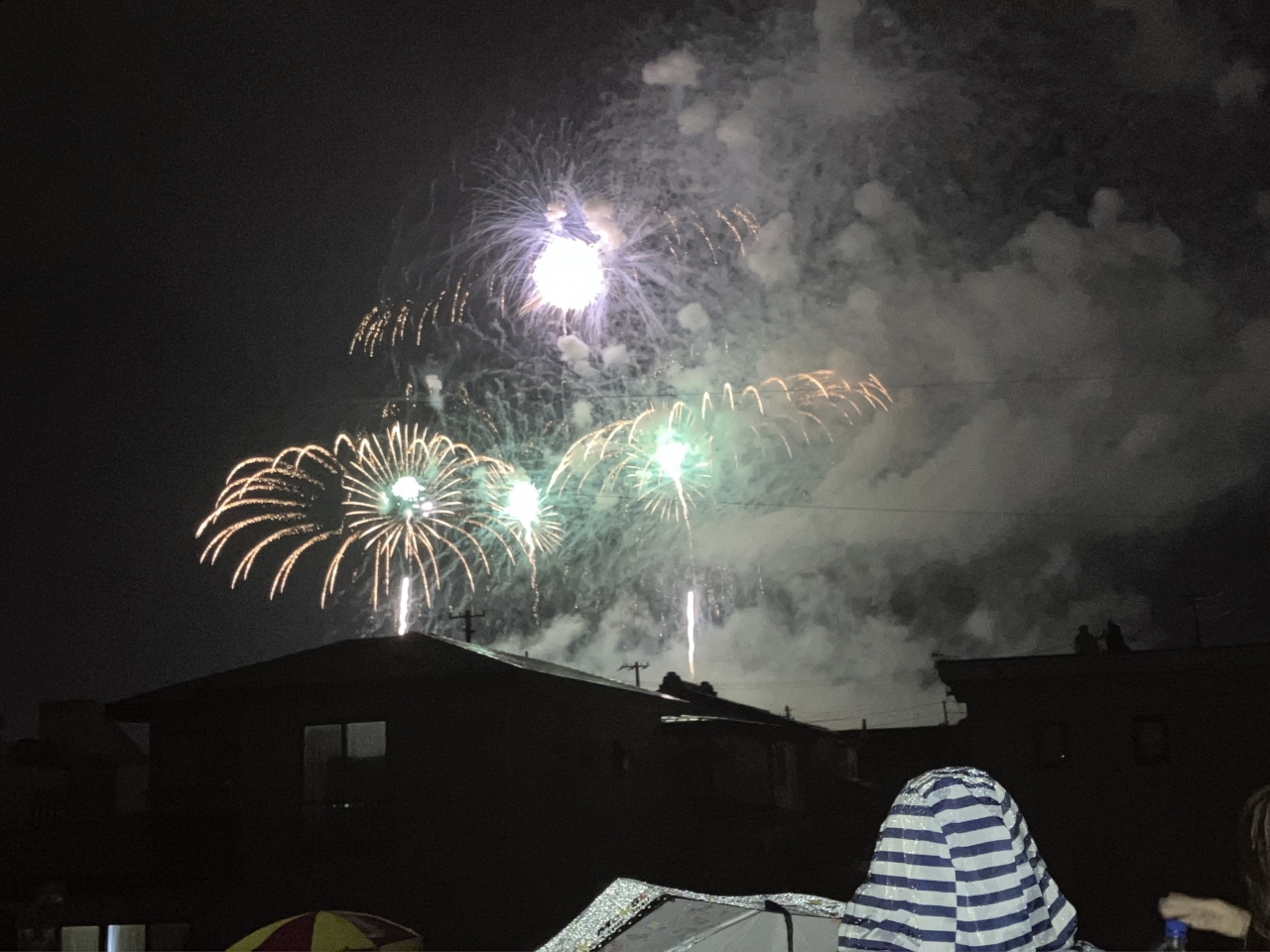 普通の花火大会とは違い、競技大会らしい、猫の顔や丸にAなど、見たこともない新しいデザインの花火もいっぱい見られました。