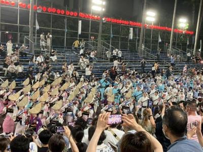 最初は各人間隔を開けての各連の個別踊りが続き、最後は1列6人、全連がびっしりずらりと並んでの、テレビなどで見たことのある、迫力のある演舞が動き出し、迫力満点です。