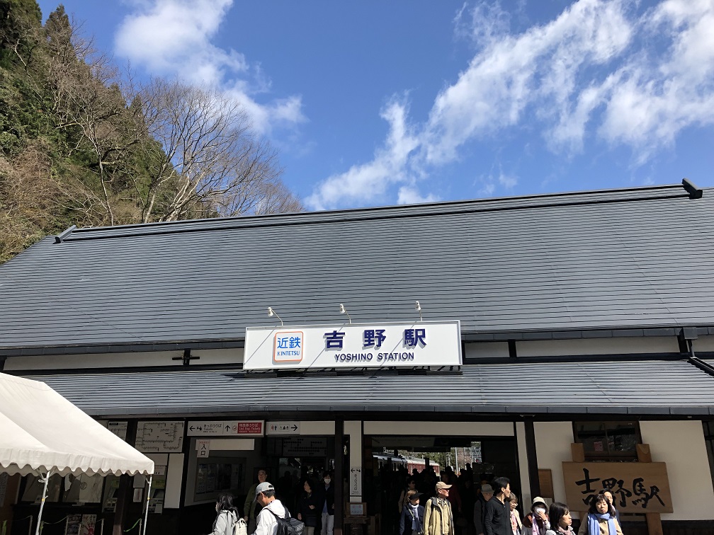 吉野駅を降りてすぐ、左が柿の葉寿司などのお店が並び。