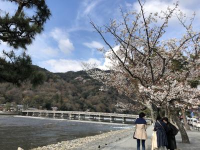 嵐山と渡月橋をバックに、花婿花嫁さんが写真撮りしていました。- 旅行時期