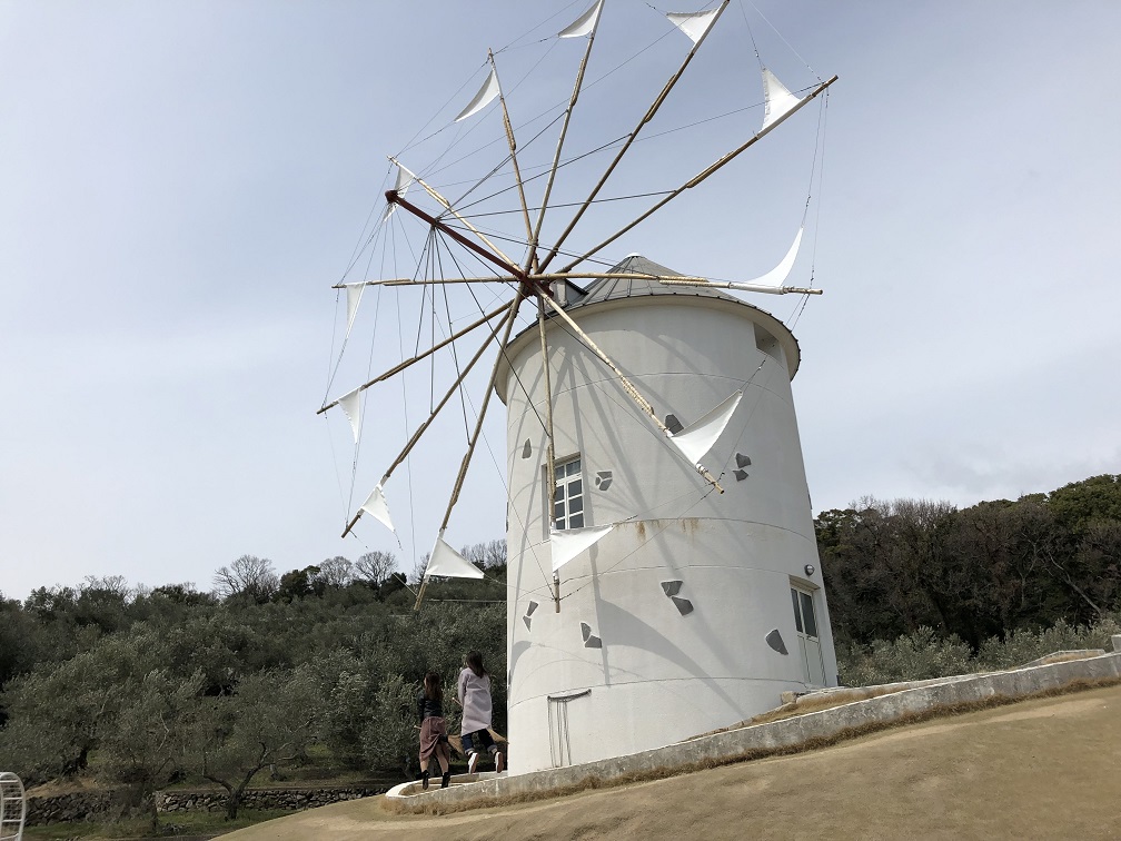 丸い建物とオリーブ色のポスト、ギリシャ風車で有名、小豆島なら映画村と同様に、ぜひという場所です。