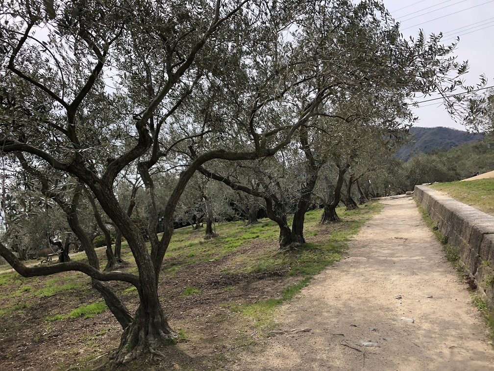 公園のオリーブの木々を眺めながらギリシャ風車へ。