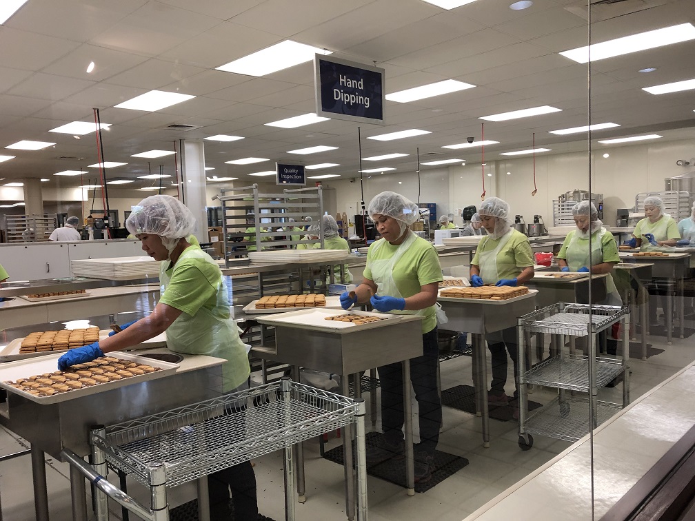 展示用ガラス張り製造工場もあり、いろいろなチョコの試食などもあります。