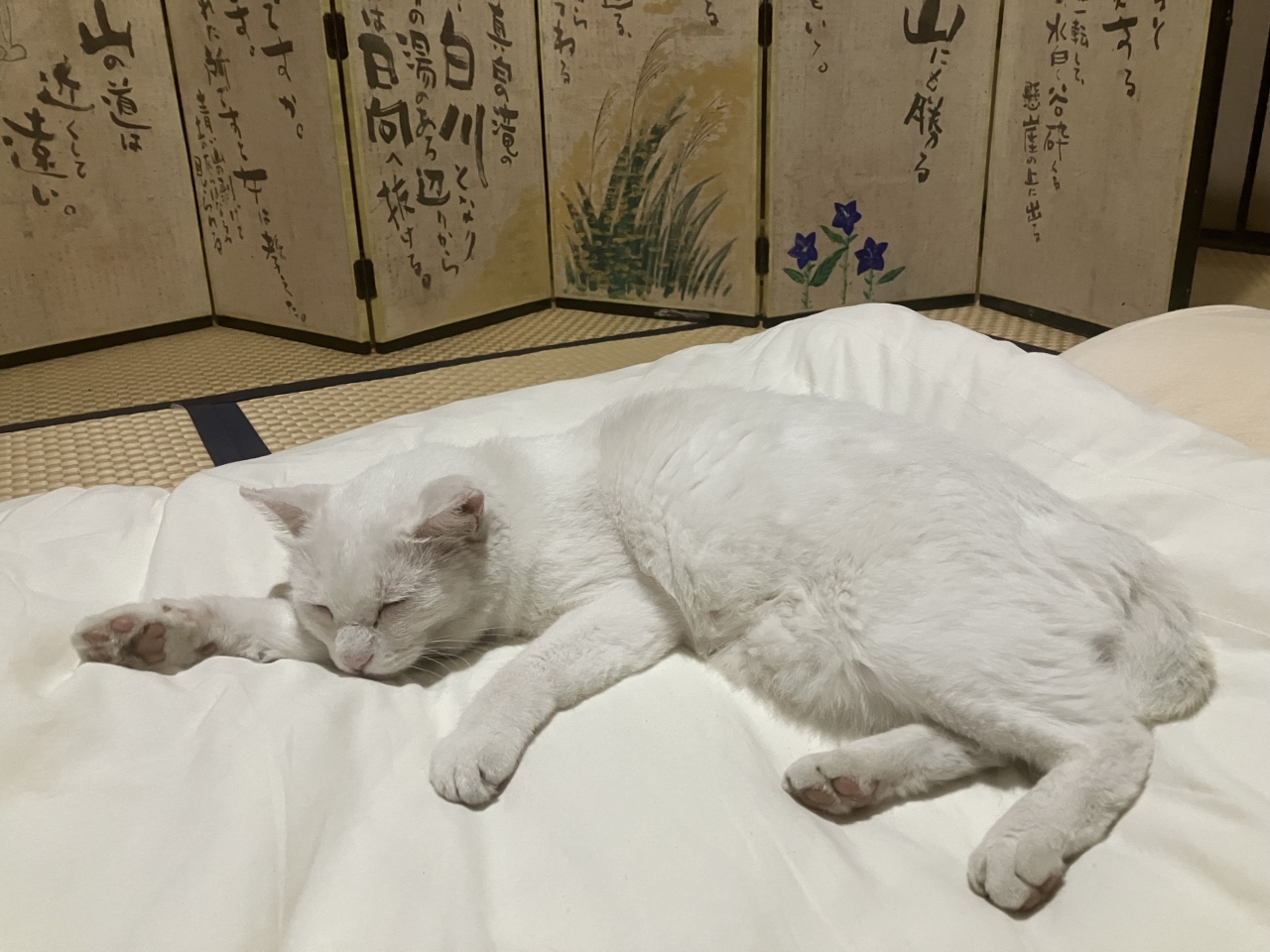 犬・猫を飼っていて、純白の猫ちゃんが、今日の客はどんなかな・・・と部屋にチェックにきてくれる。