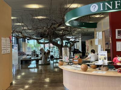 駅には観光案内所と休憩箇所があり、屋内の大きな木のインテリアも素敵です。