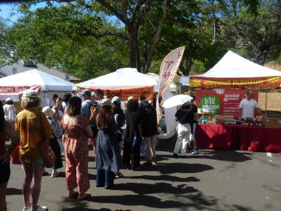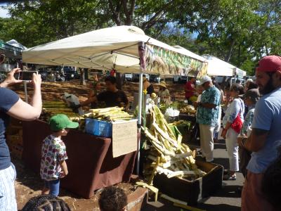 ホテルから20番の路線バスに乗り継魏、土曜日にしか停車しないKCCマーケット停留所に下車。9時頃に着いたが、すでに多くの観光客でにぎわい人気の高さを示している。ここの特徴はこの土地で清算した商品を加工したりスムージにしたり特産をうまく生かした若者向けのマーケットとして人気がある。