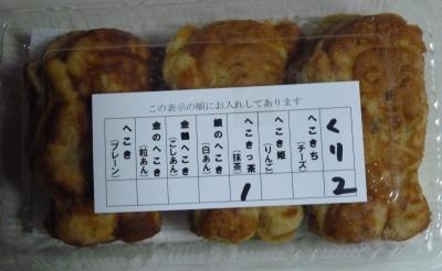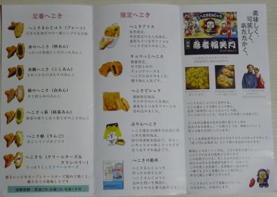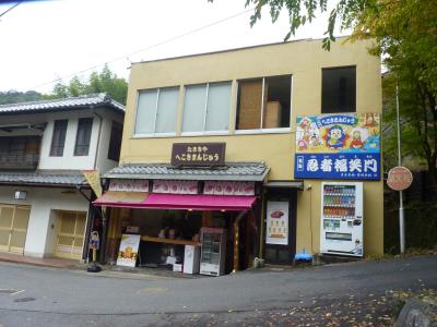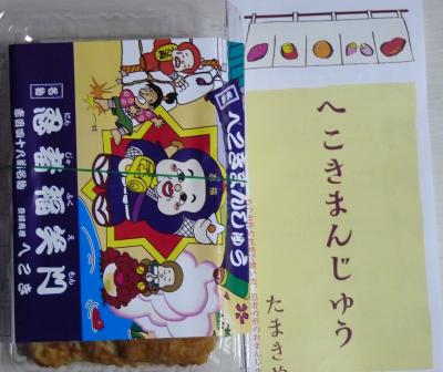 赤目四八滝の入口の商店街で見つけました。たまきやの「へこきまんじゅう」といいサツマイモの生地で焼いた、忍者の形をした饅頭だが昭和30年代から売られておりこの辺りではゆうめいだそうです。ネーミングはサツマイモを食べたら屁が出ると云うそのままの意味だそうです。今では定番へこきで7種、限定へこき4種とバラエテイに富んでいる。