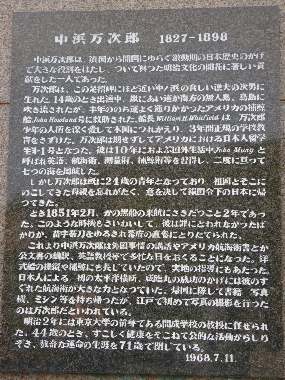 足摺岬を見学する途中の公園内に海に向かって堂々と建つ万次郎は風格がある。歴史ではよく名を聞くが、当地の出身とは知りませんでした。ここで出会うことで彼との親近感がよりわいてきました。高知には著名人が多く出ていて、このような観光名所に銅像を建てPRしているのはうまいやり方だと感じた。