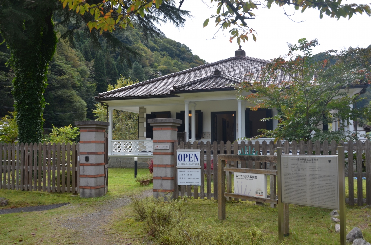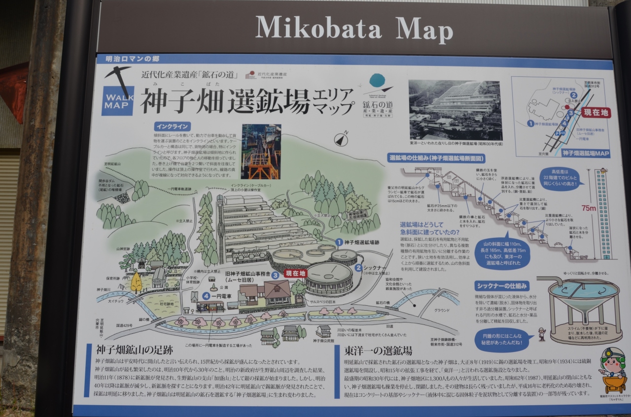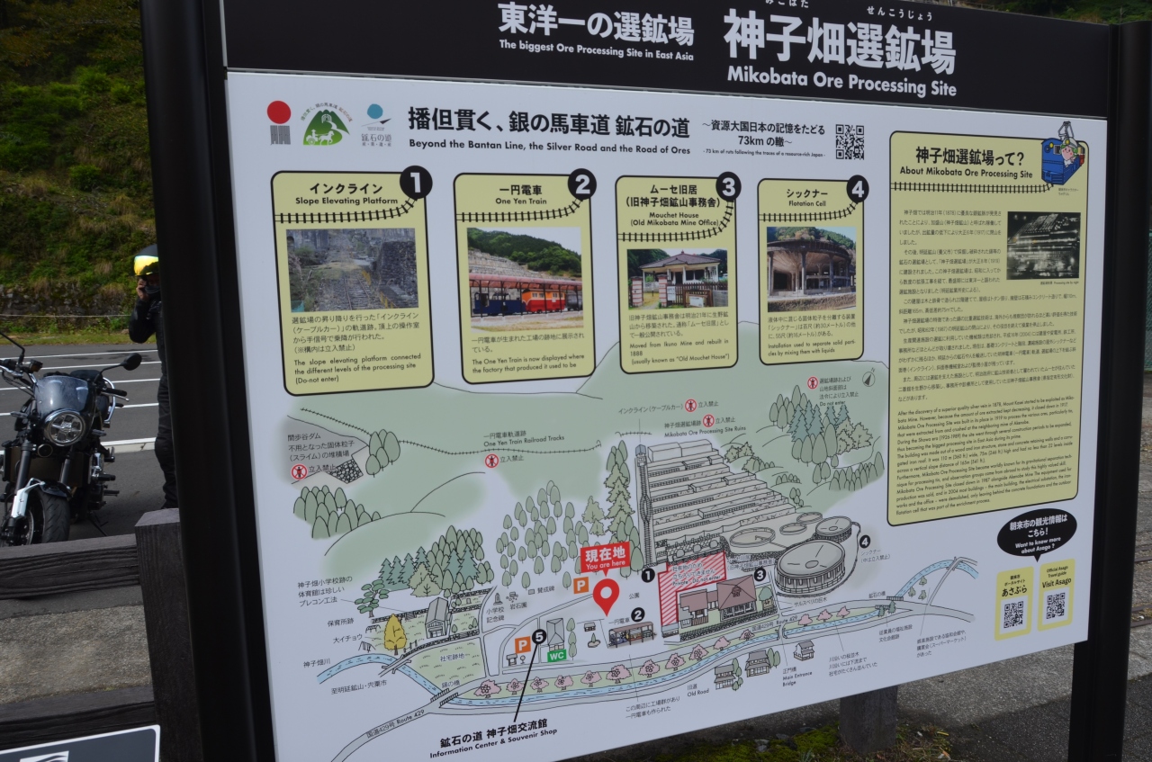 朝来インターから車で約30分ほどで神子畑(みこばた)選鉱場に着く。山肌に階段状にそびえる選鉱場は見る人に迫ってくる迫力がある。現在は閉山して静まり返っていて静寂さの中にその威容を供えている。その他フランス人技師が宿泊していた当時の宿舎も無料で開放されている。