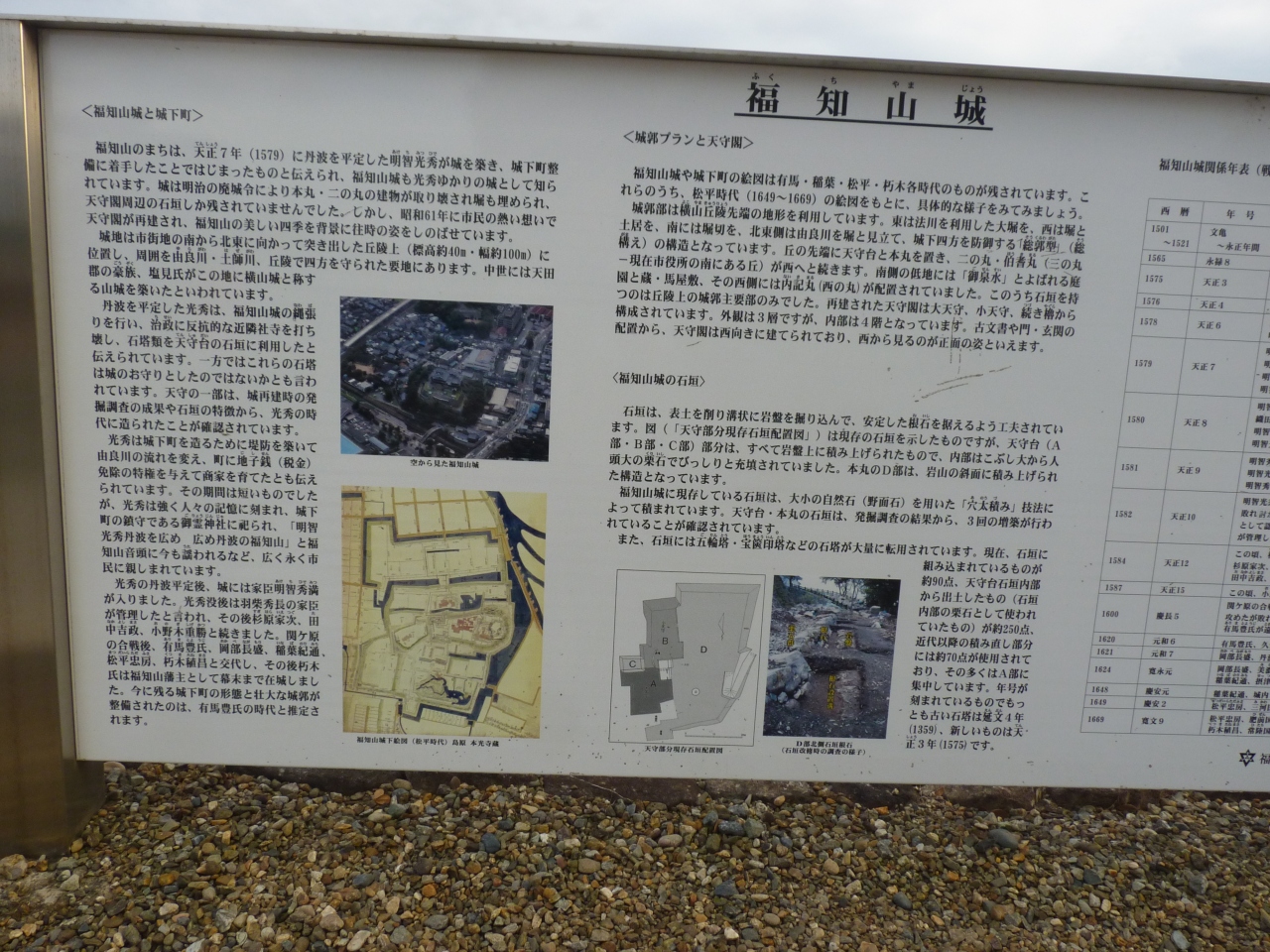 福知山は今年大河ドラマで賑わっているので明智光秀のゆかりの地を訪問した。まずお城見物で、この城は昭和61年に再建されたそうだが小高い丘の上に立つお城はなかなか見どころがある。ゆっくりとした坂道を登り詰めると城の入口に着く。入場料を払い城内見物をして天守から眺める市内の風景は格別であった。見どころとして店主からの眺め、豊磐の井、銅門番所等がある。