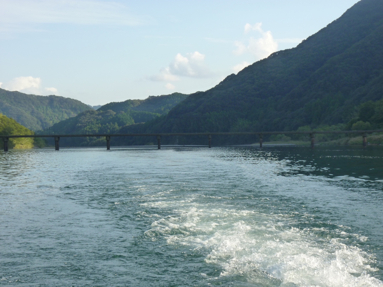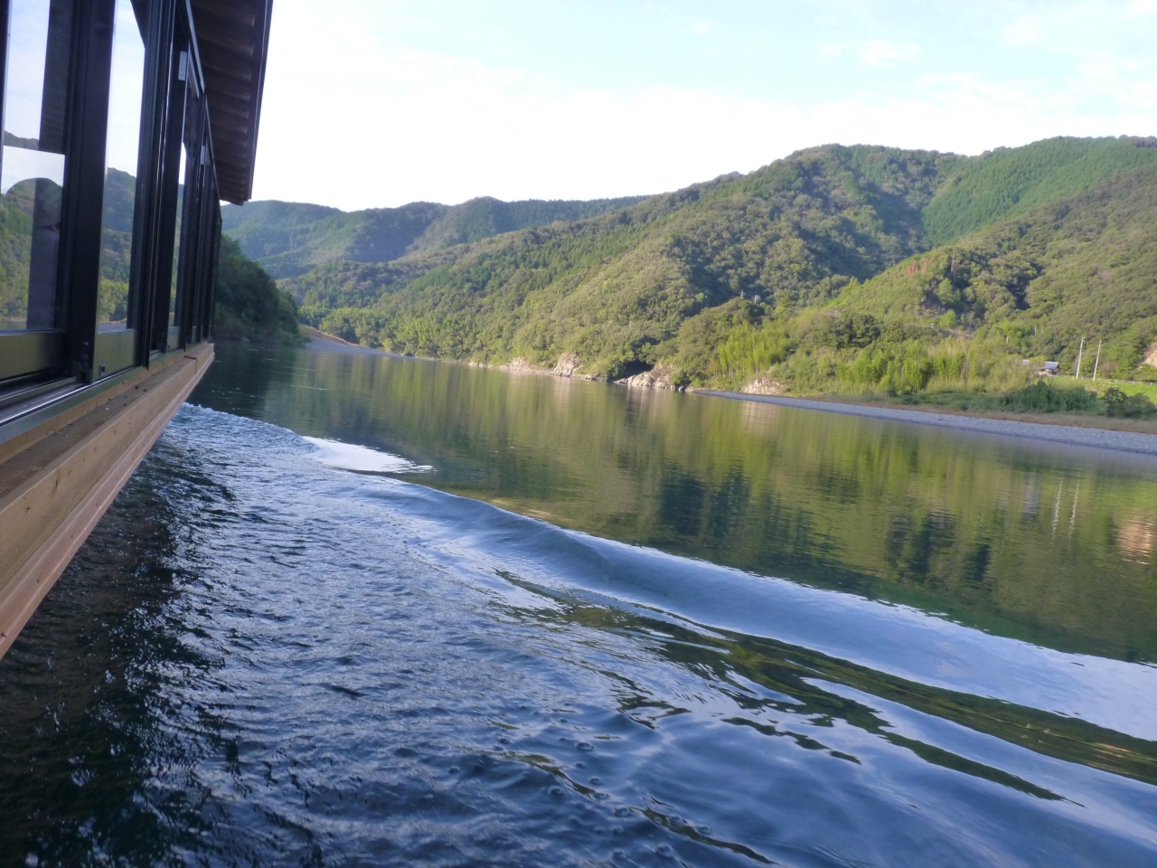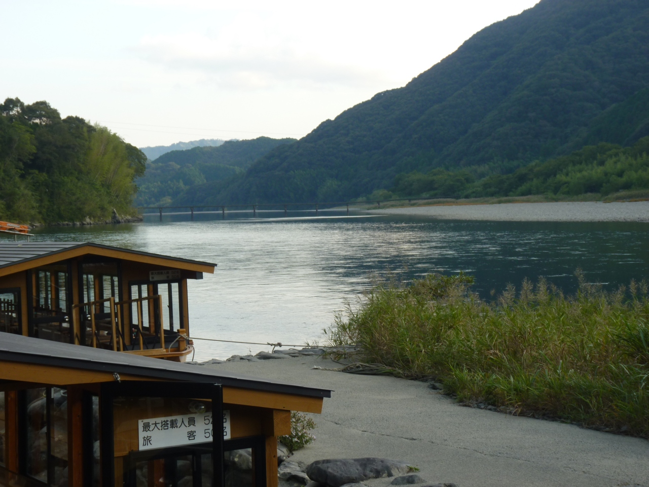 中村駅より国道441号線で車で約20分四万十川を登ると四万十川屋形船の遊覧船が出ている。約30分ほどの観光で案内してくれる。青く澄んだきれいな川は他に無い自然の美を売り物にしている。ここの見どころの一つは潜水橋(高瀬沈下橋〉がかかっておりその下を潜り抜けUターンして上流に向かうコースであった。水は清く静かな流れの中アユが飛び跳ねている姿も見られた。