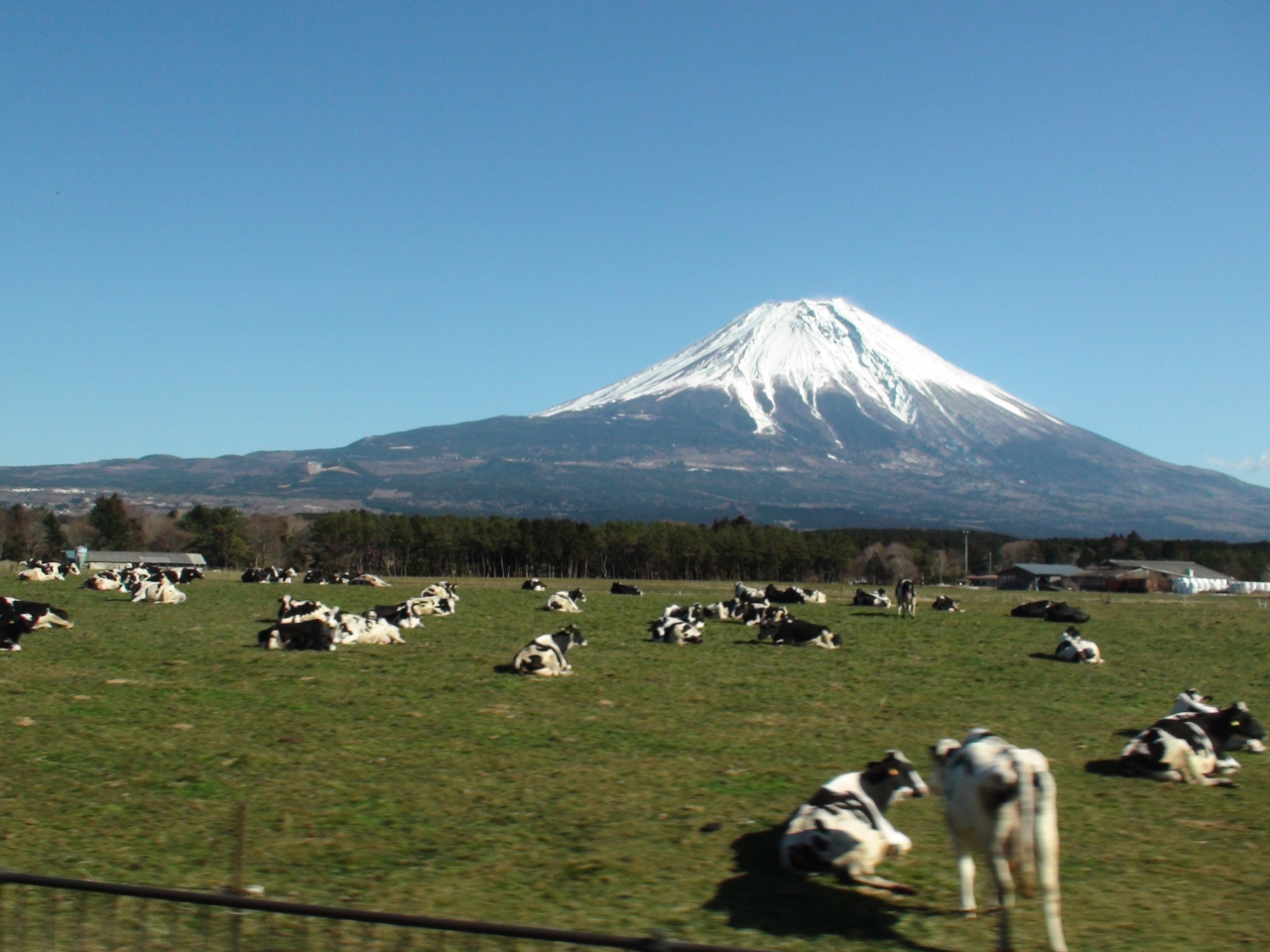 富士もいろんなポイントから見れるが一番気に入ったのが、幅広いすそ野が全部見え、ゆったりとしたその雄姿はまさに日本が誇れる美景にふさわしい姿で、しばし見惚れていました。牧場には冬にもかかわらず放牧され良い被写体にも恵まれた一コマです。