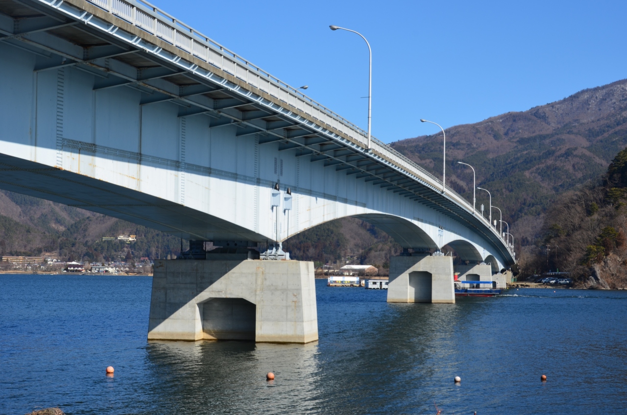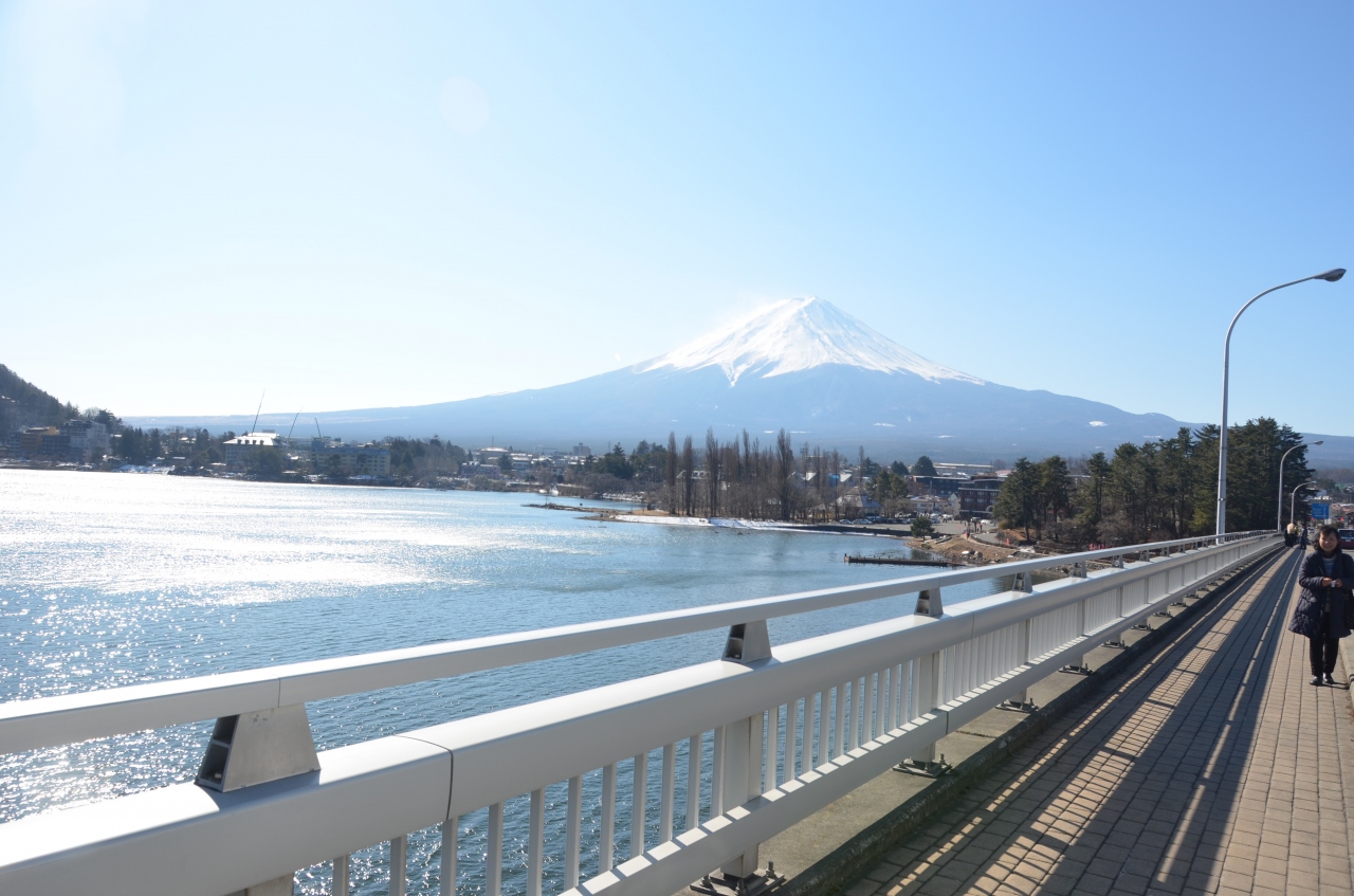 午前中の山の天気は安定しており撮影には良いチャンスだが、河口湖側から見る富士は逆行になり、目で見る風景とは多少異なるが、ビューポイントを探し回ると川口大橋から見る位置が個々の撮影に良いと聞き橋の中央まで行ってて撮りました。