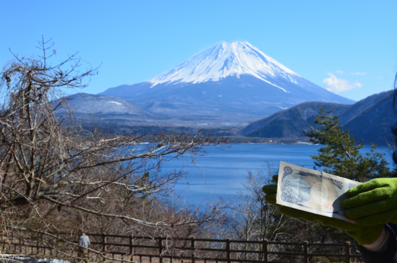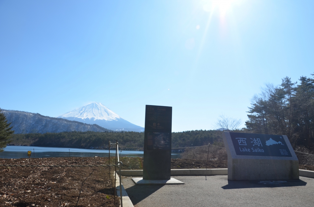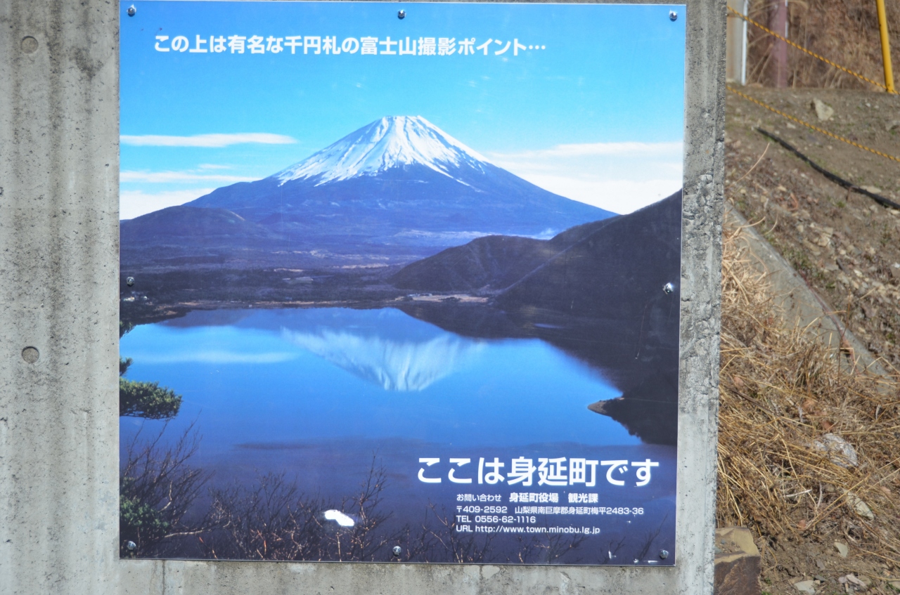 最後の訪問地の本栖湖は千円札のモデルになった撮影場所があると聞きたのしみにしていたが、やはりお札に載っているような「逆さ富士」は今回の旅ではだめでした。やはり冬場の風の吹く時期は難しいかもしれません。案内板に撮影された写真がありましたので、イメージして今回は収めました。