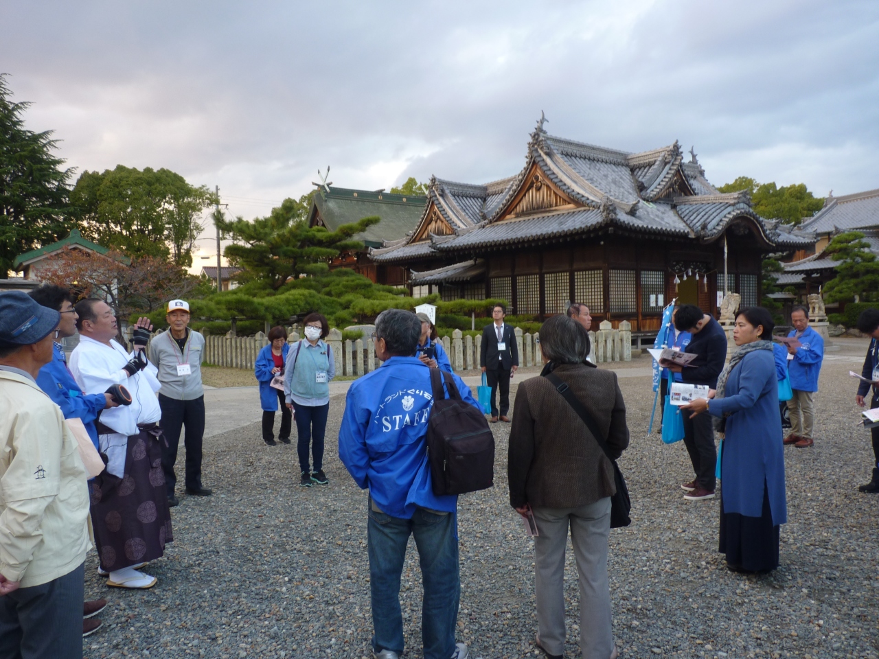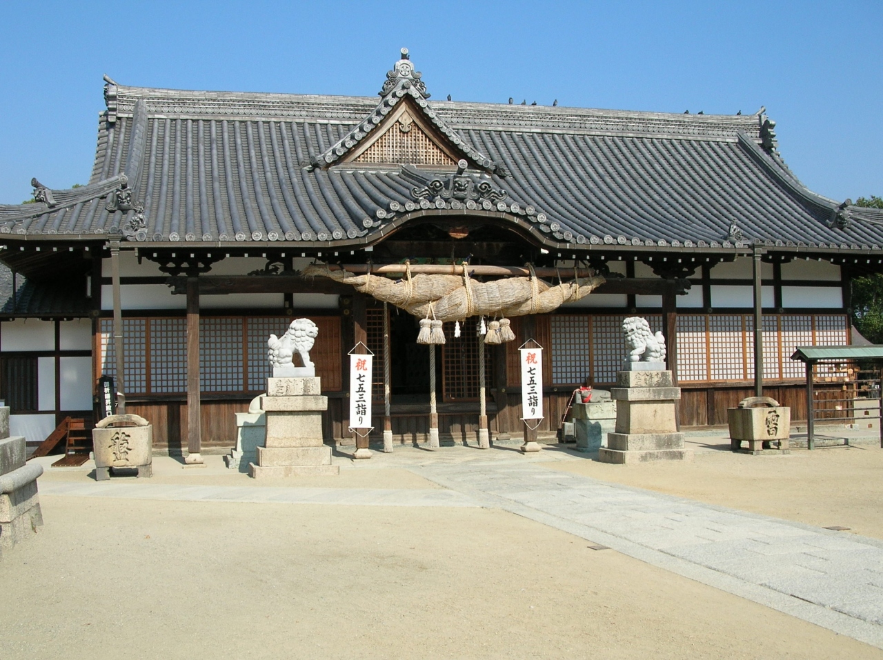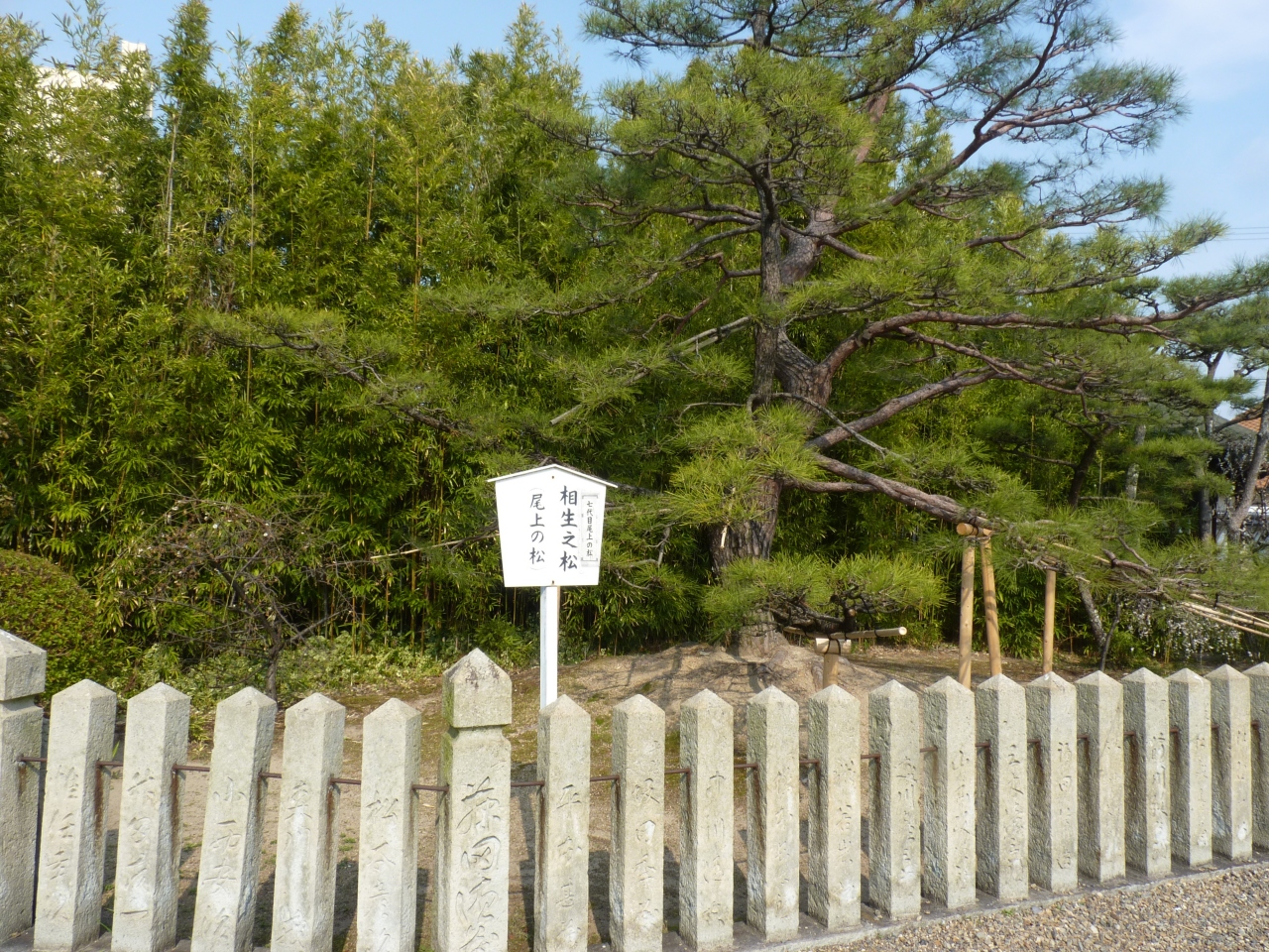 浜国道を西へ進み山陽電鉄曽根駅から北へまっすぐ進むと立派な随身門が見えてくる。ここは曽根の松としても有名で官公が太宰府へ流されるときに植えられた松といわれている。秋には播州でも指折りの祭りがにぎやかに行われる。春の梅の花も見ごたえがある。