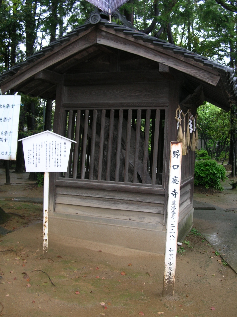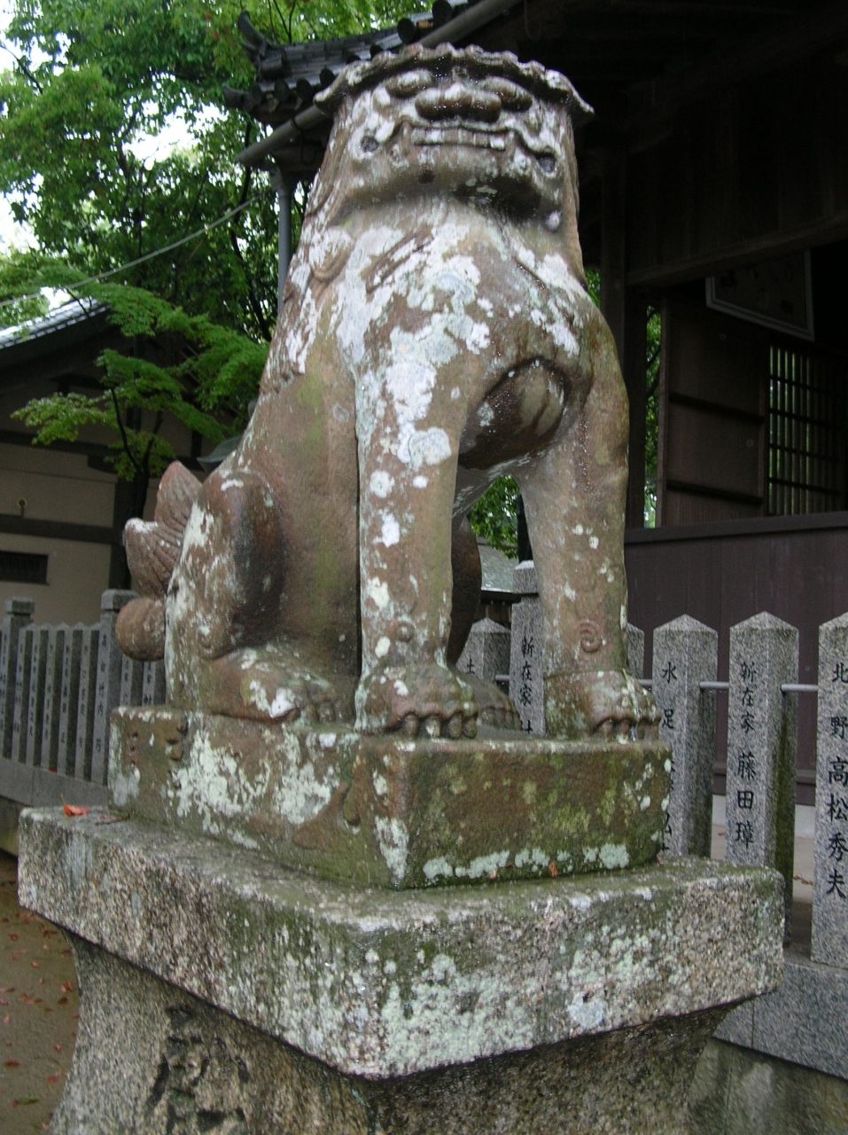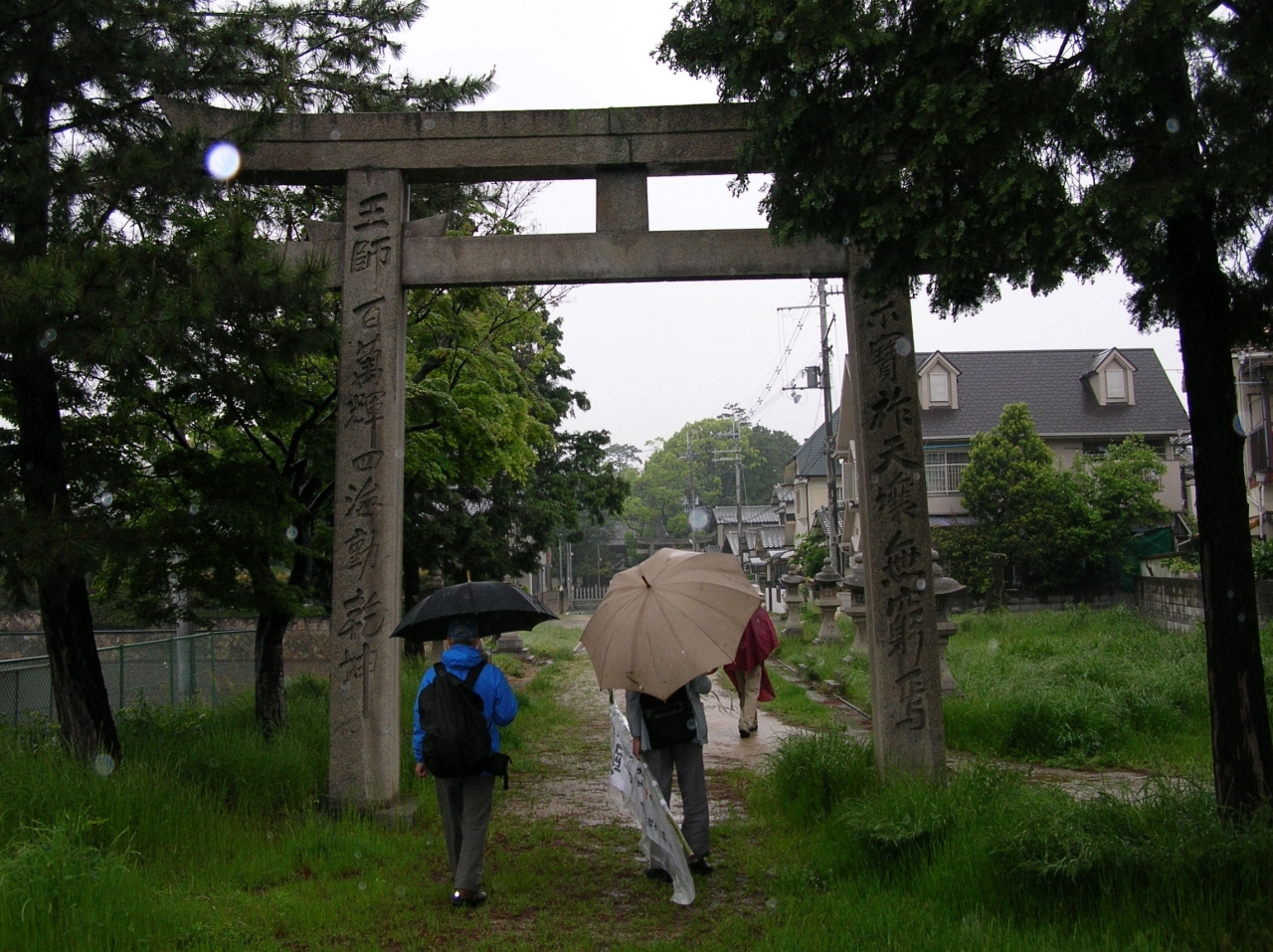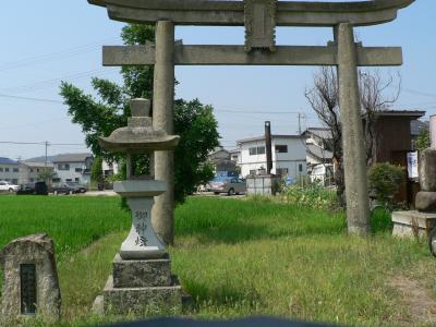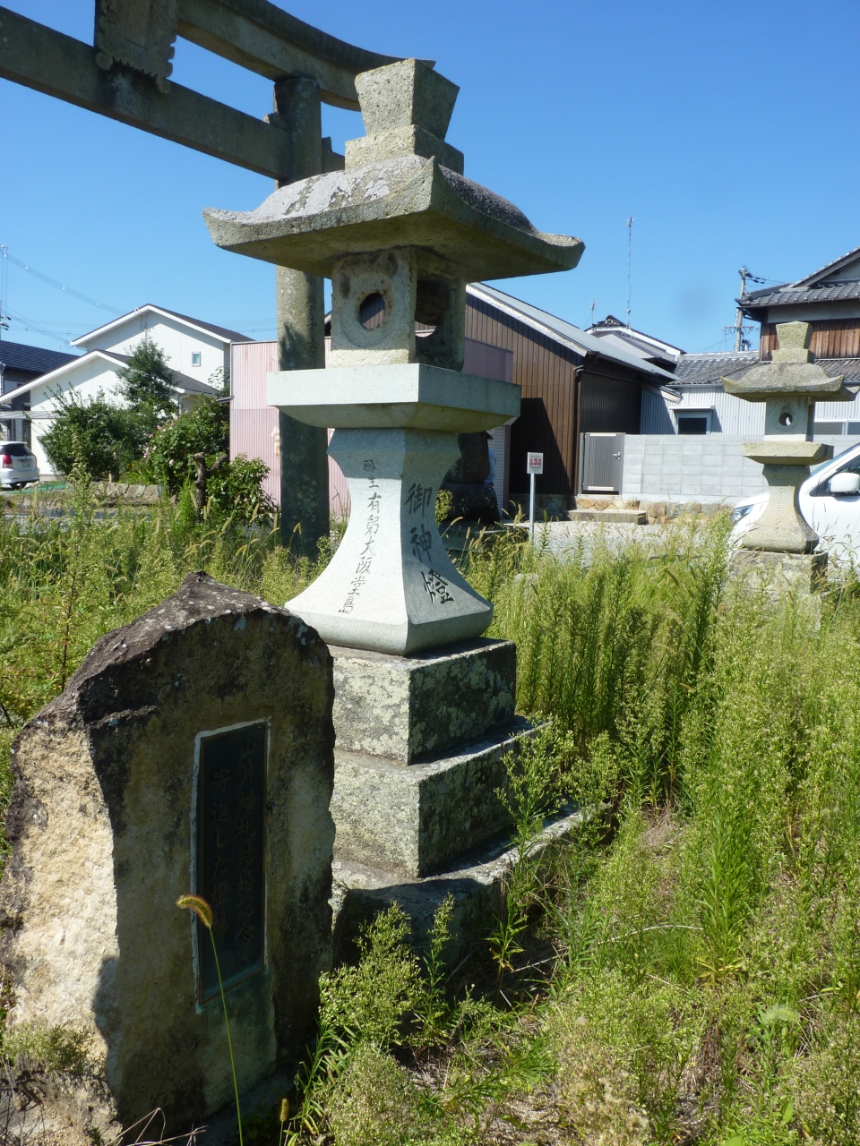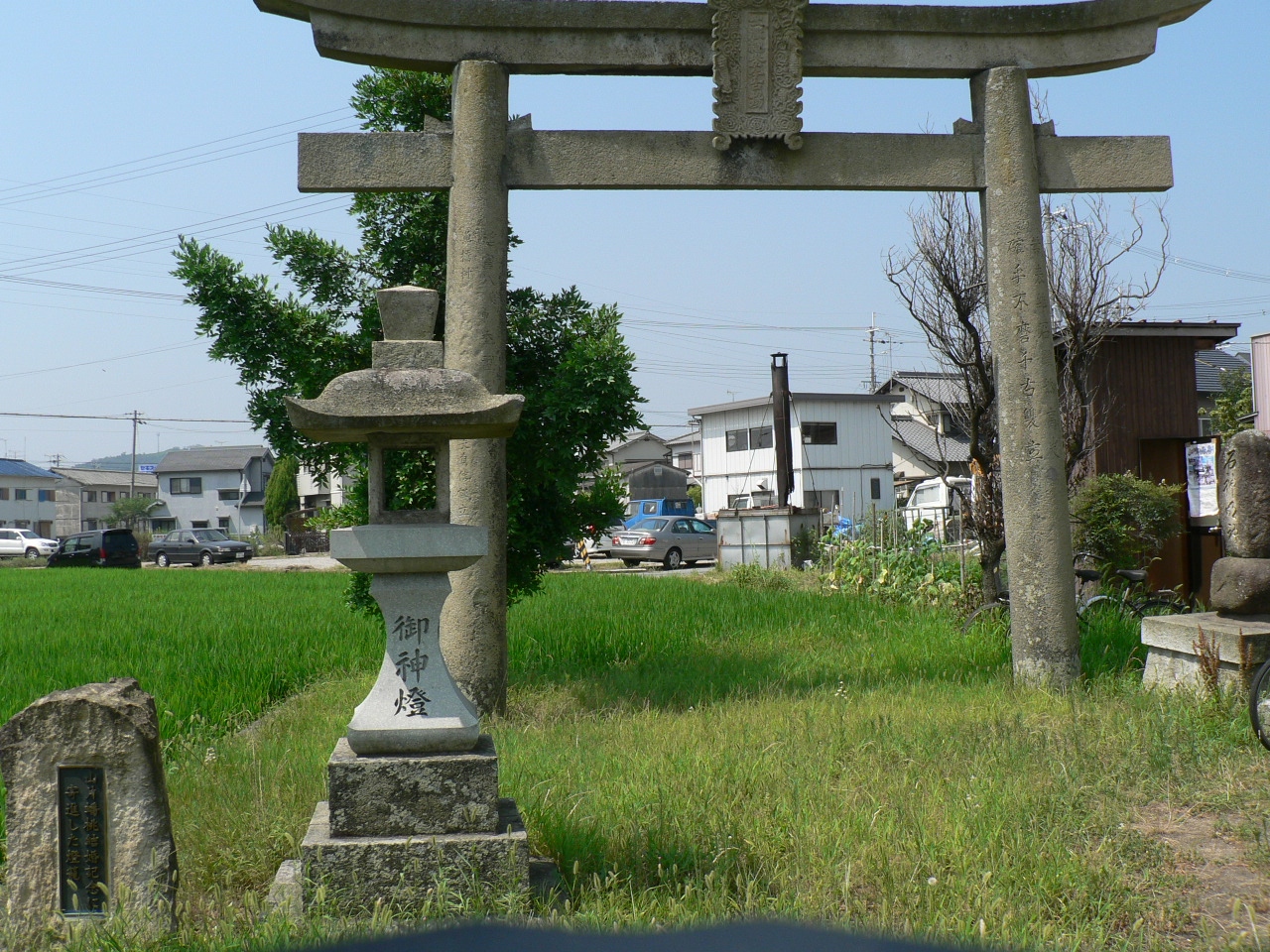 高砂市の神爪にあり、宝殿駅から西へ踏切を渡り10分ほどで神爪の村に入口に入ると、左側に鳥居と灯篭が見えてくる。鳥居を正面に見て神社を探すが見当たりません。子の鳥居は石の宝殿へお参りする入口に当たるようだが、道らしきものはない不思議な鳥居です。隣には山片蟠桃が寄贈した灯篭も見え、山片蟠桃生誕の地でもあります。