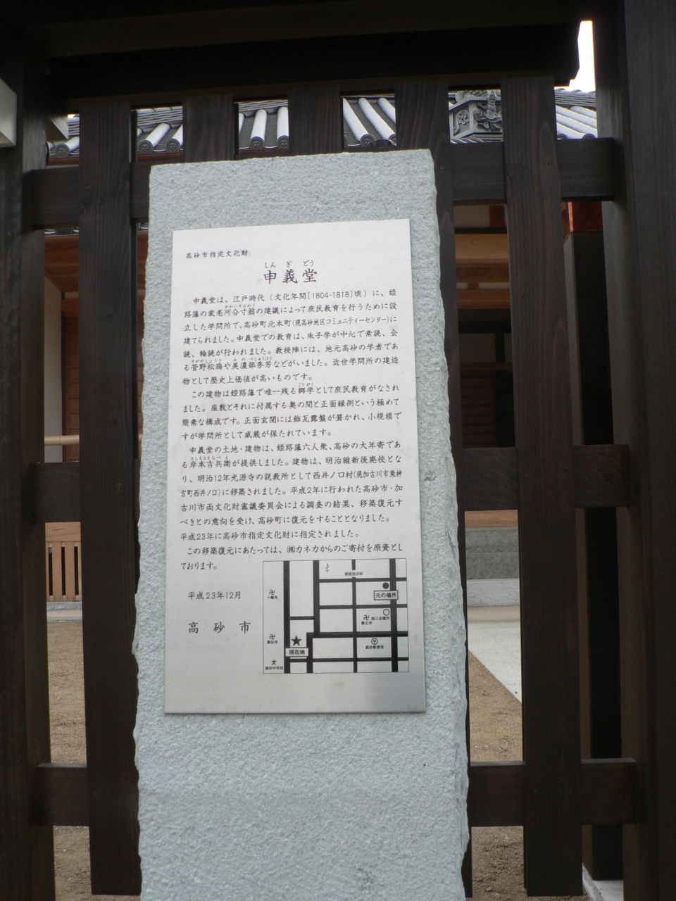 江戸時代後半に建立された姫路藩が町人のための学問所として認め、多くの著名人を出している。この建物は長らく解体され保存されていたが最近修復された。もとは北本町の岸本家近くにあったものを西堀川の埋め立て地区に移転して修復再建されたもの。現在もいろんな学習塾として活用されている。