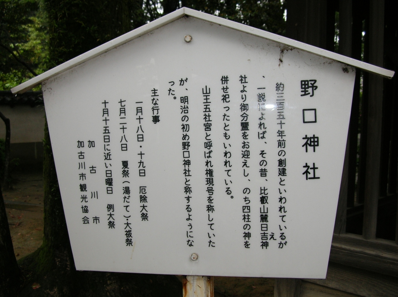 旧西国街道にある教信寺より少し東に行った街道筋に大きな鳥居が見えてくる。延暦寺の守護神日吉大社から分霊を迎え、他の四社の神と合わせて祀ったといわれ五社宮野口神社とも地元では呼ばれている。また教信寺とも同じ天台宗の関係で深い関係があり、ここでいろんな行事も行われている。