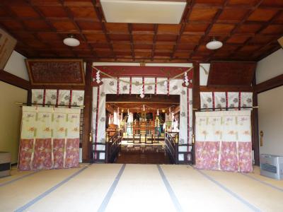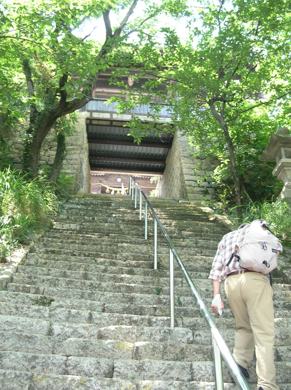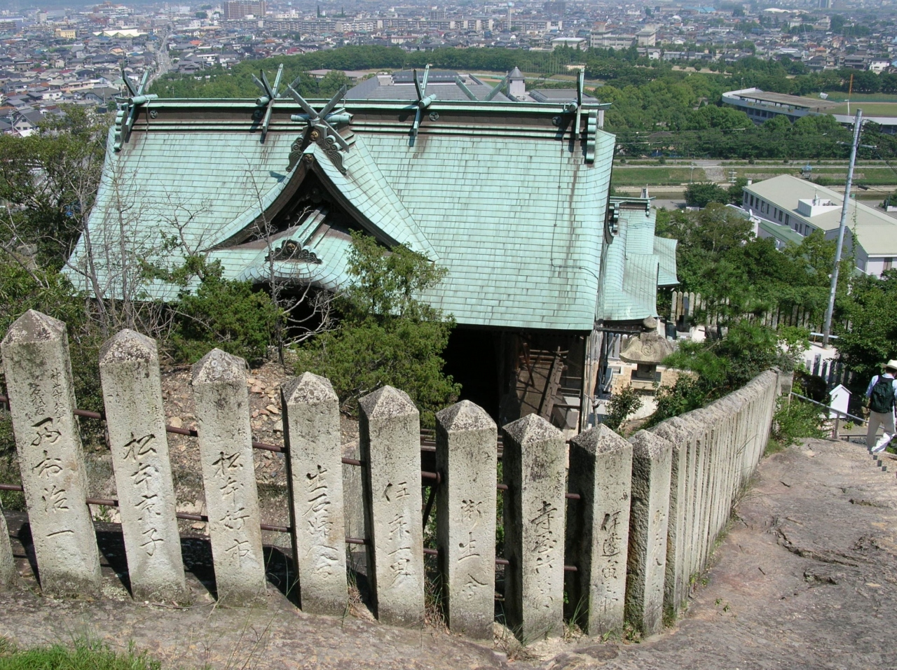 JR宝殿駅から南へ車で約7~10分ほど行くと山の突き当る。ここから参道を登りとちゅから急な階段を昇り詰めると社殿につく。本殿内に重さ500トンといわれる巨石が水の上に浮いているように見える。この状態を浮石と呼ばれ三大奇石と呼ばれている。山の上からの眺めは内海が見下ろせて素晴らしい。